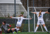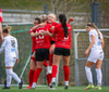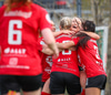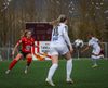 Andrea Mist tekur spyrnuna og setur hann fyrir en Eva rís hæst og grípur boltann.