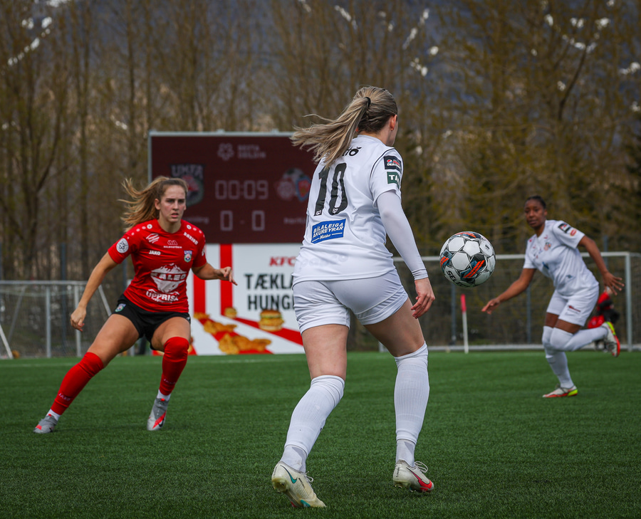 Hildur Karítas gerir vel og kemur sér fram hjá Rakel Sjöfn vængbakverði Þór/KA og kemur með góða fyrirgjöf sem Jade Gentile kemst í en nær ekki að stýra boltanum á markið.