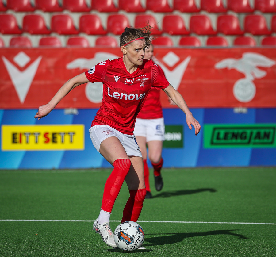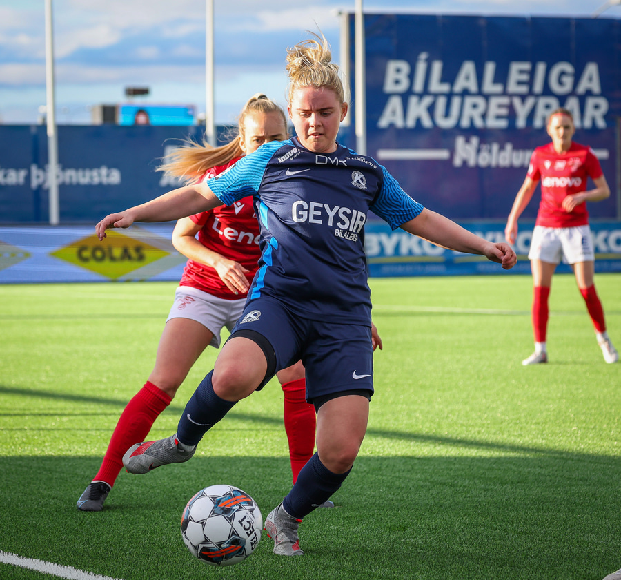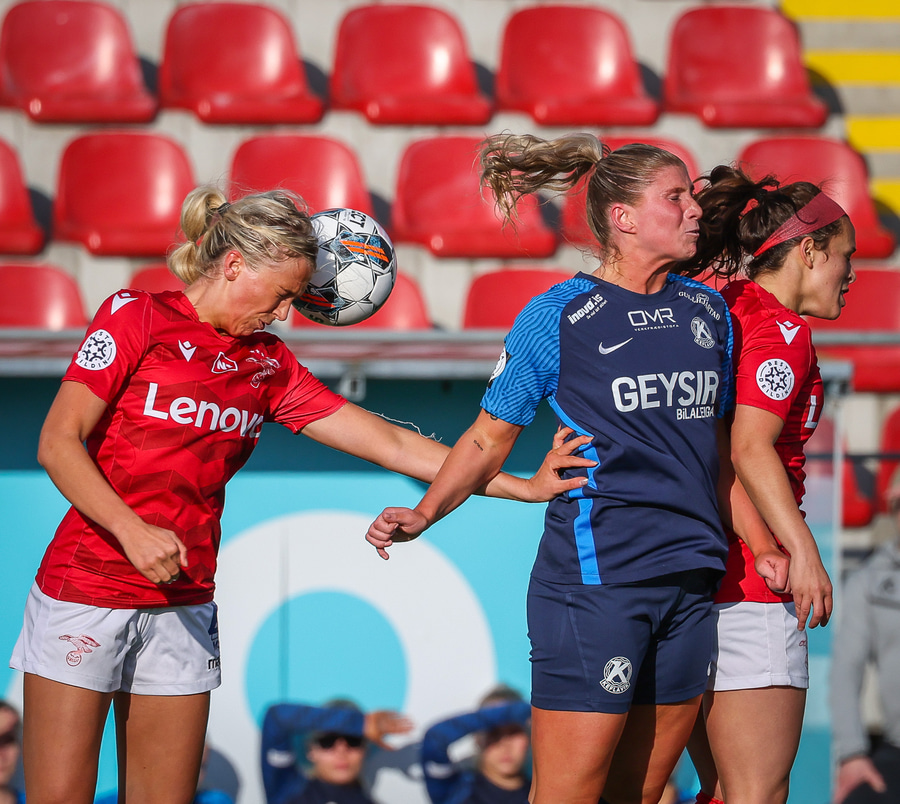 Elín metta með fyrirgjöf frá vinstri á fjær þar sem Þórdís Hrönn var og Þórdís nær skoti sem fer af Kristrúnu Hólm og í fætur Samantha.