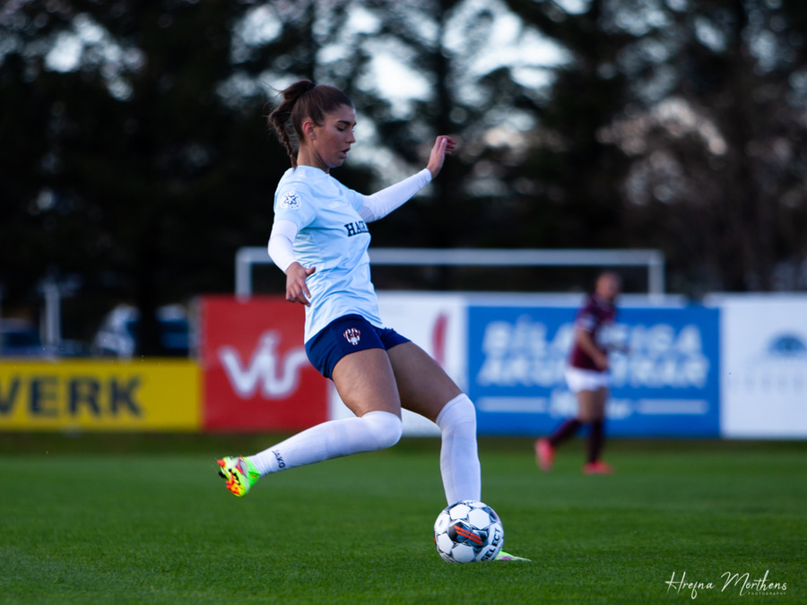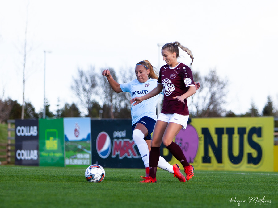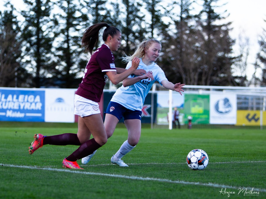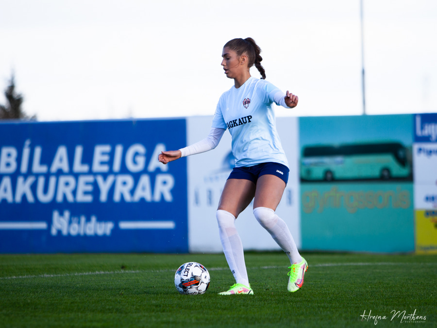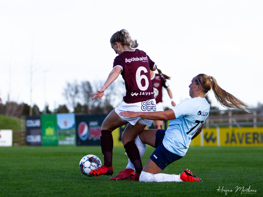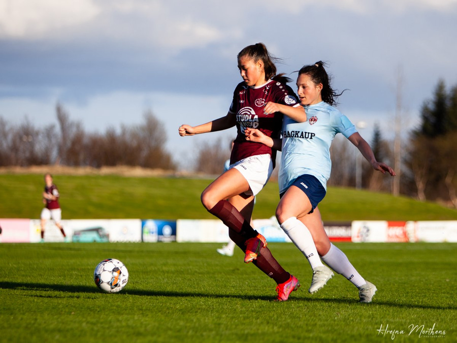 Magdalena á góða takta fyrir utan teig og kemur sér inní teiginn en Íris er á undan henni í boltann.