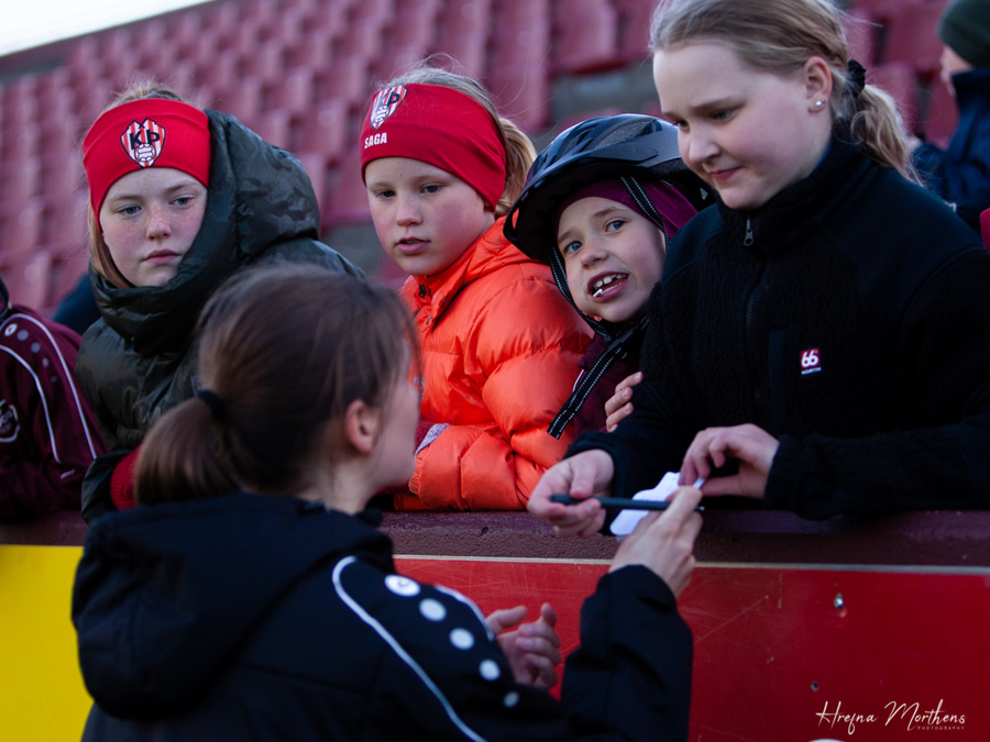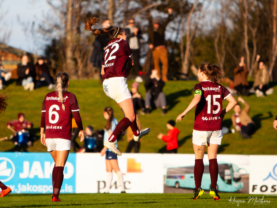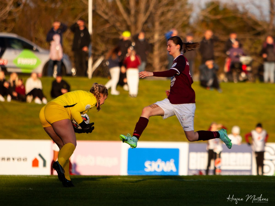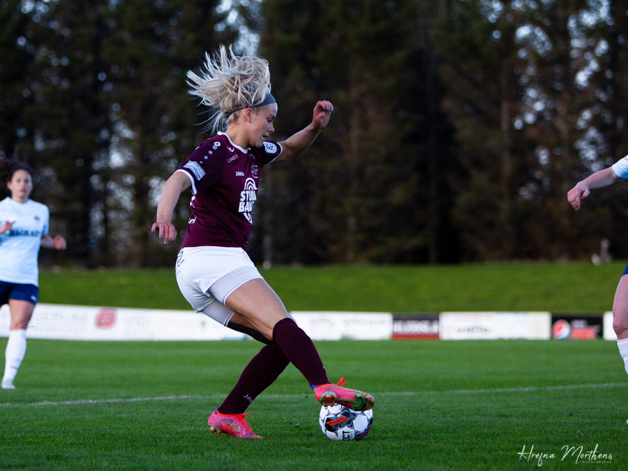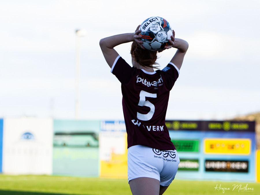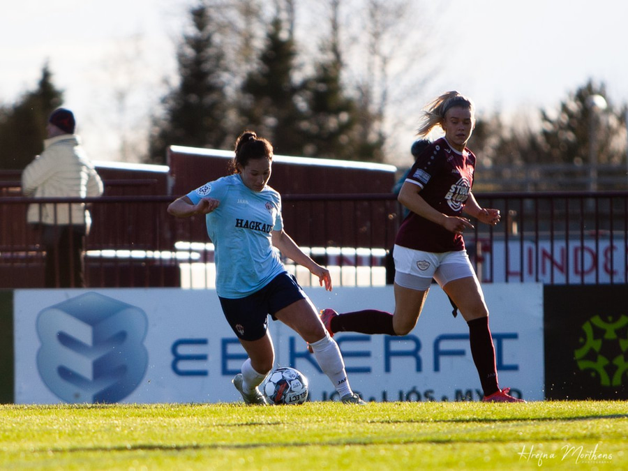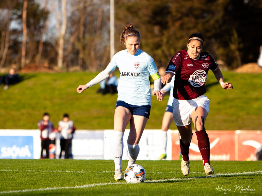 Magdalena á góða takta fyrir utan teig og kemur sér inní teiginn en Íris er á undan henni í boltann.