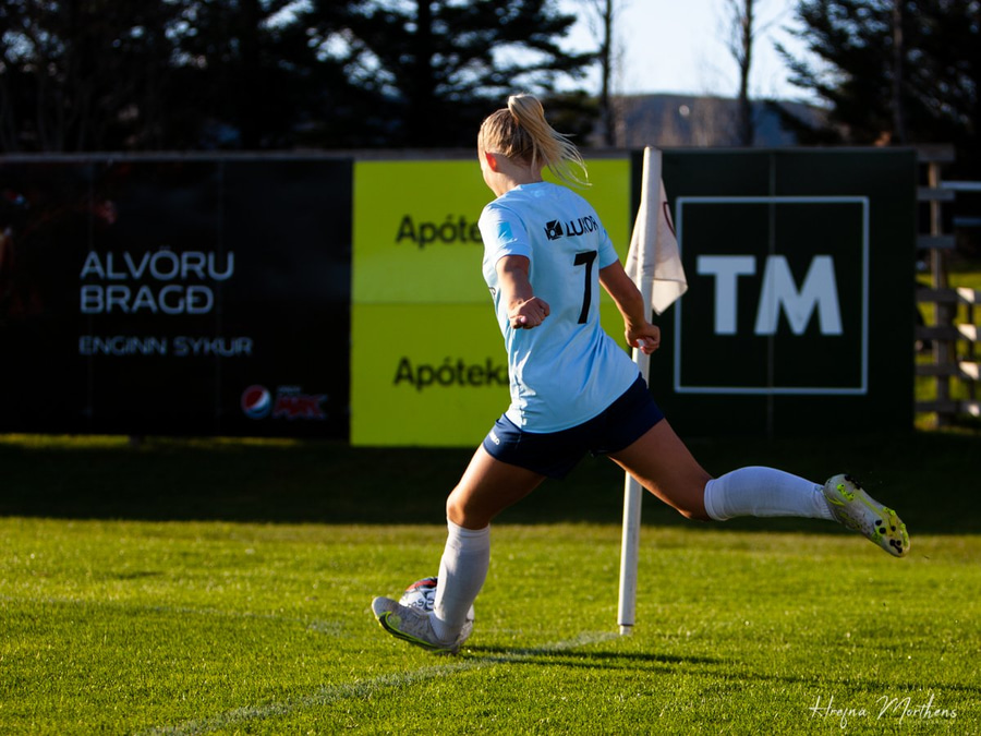Bergrós fær boltann við endalínuna og setur boltann inní teiginn en Unnur verður fyrir sendignunni og ekkert gerist.