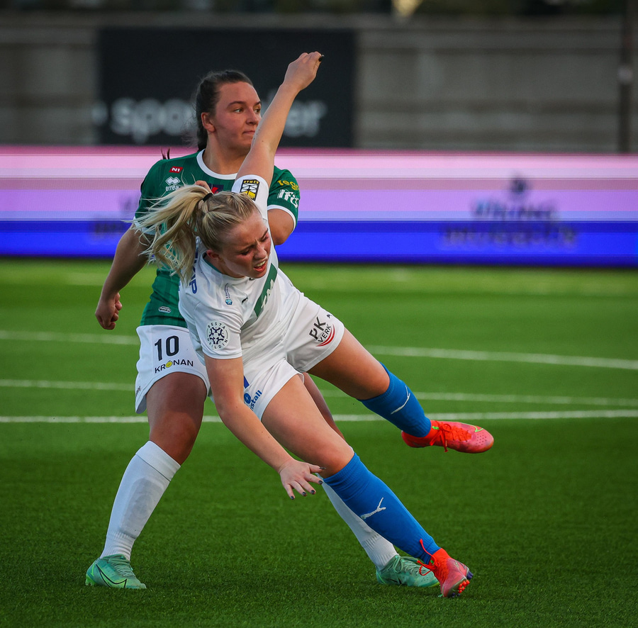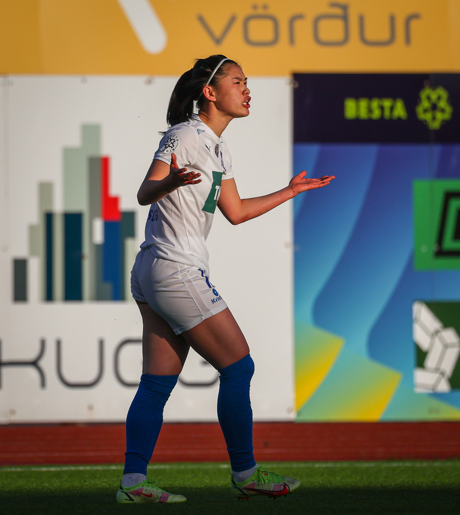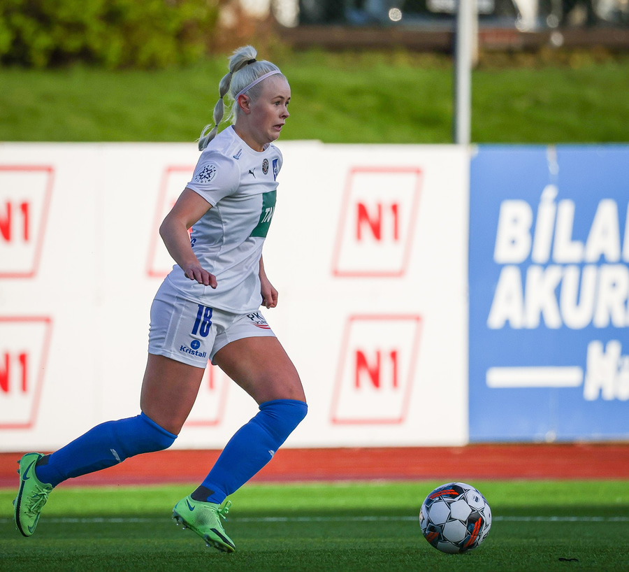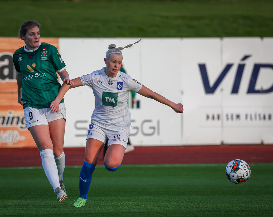 Alma Mathiesen á kraftmikin sprett upp miðjan völlin en missir boltan aðeins of langt frá sér og á mjög kröftuga tæklingu á Karítas. Alma dæmd brotlegt og heppin að sleppa við spjald.