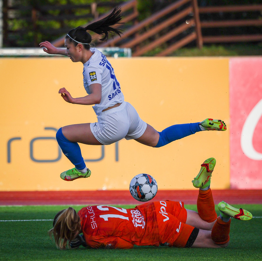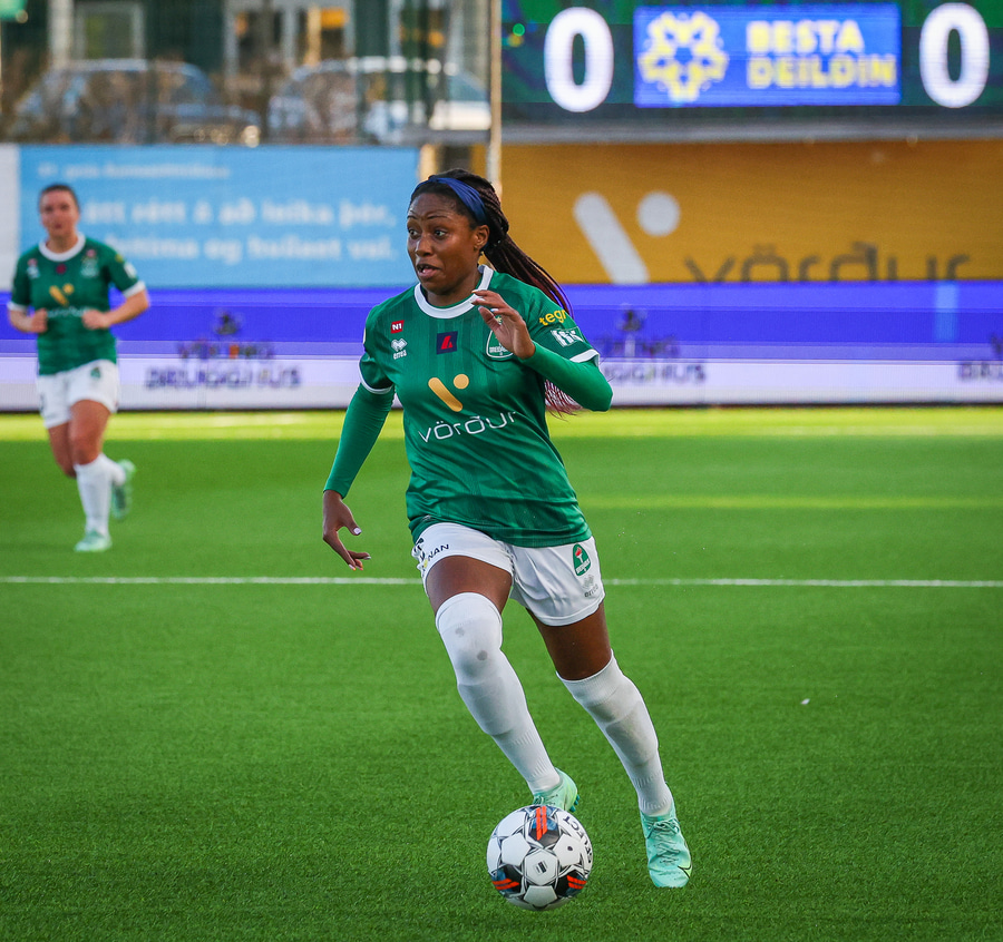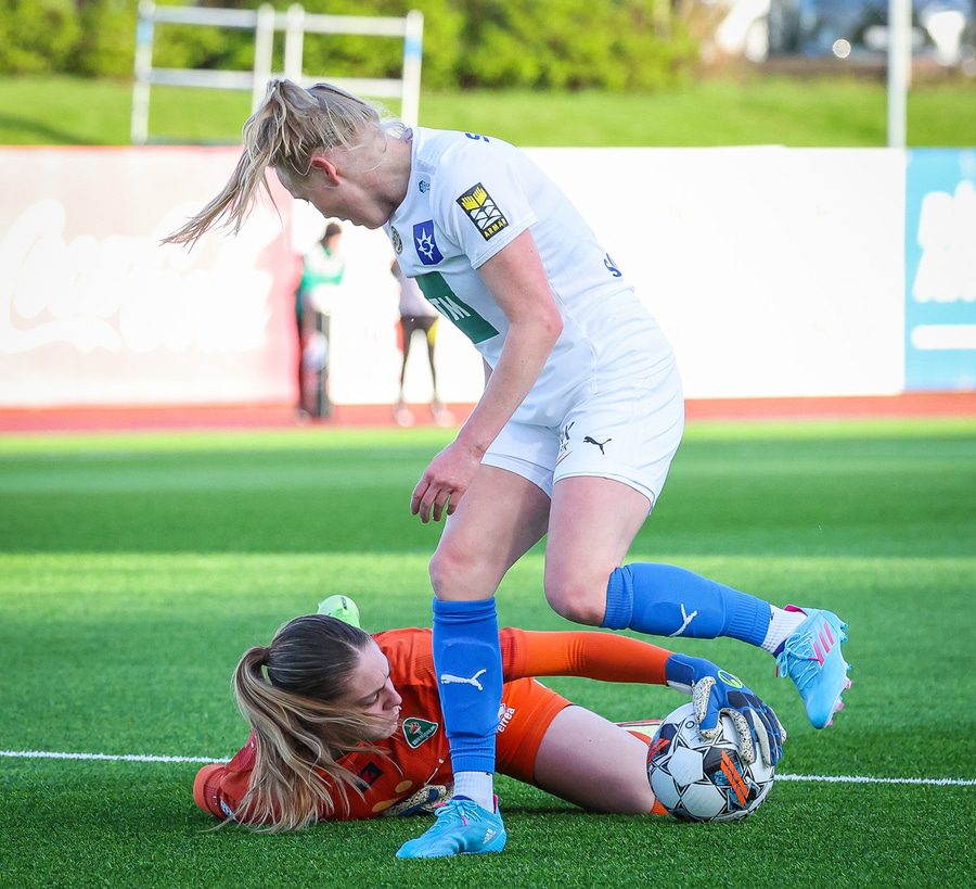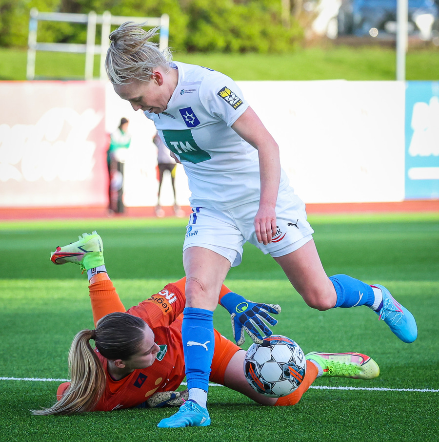 Hildigunnur á hér geggjaðan sprett og sendir fínan bolta í gegn á Jasmín sem er ein gegn Telmu sem gerir vel og lokar á hana. Þær skella hinsvegar saman og Jasmín þarf að fá aðhlynningu utanvallar en getur vonandi haldið áfram
