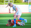 Karítas liggur þessa stundina á vellinu og hlýtur aðhlynningu. Nær vonandi að halda leik áfram.