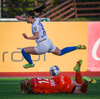 Melina á sendingu í gegn á Hildi sem dettur og setur skrýtinn bolta í stöngina!