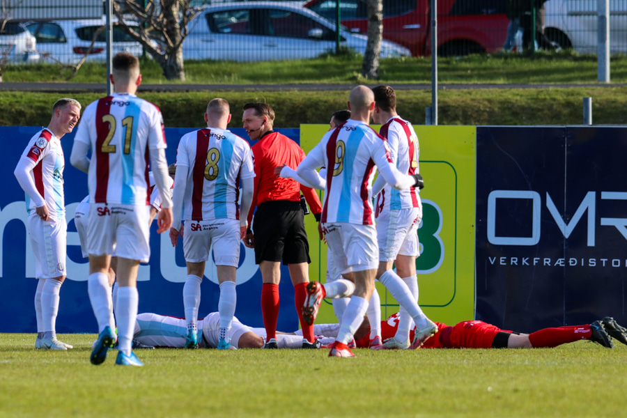 Bjarki og Viktor lenda í samstuði í atvikinu sem leiðir til marks Keflavíkur. Bjarki fær að sögn kollega hnéð á Viktori beint í andlitið,