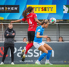 Jasmín skallar seinni boltann yfir Auði eftir hornið.