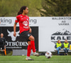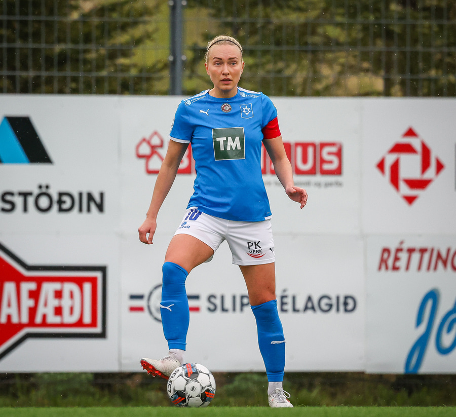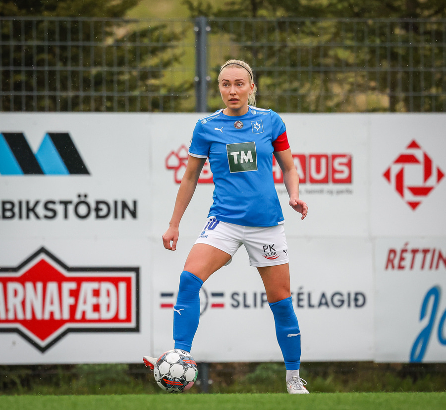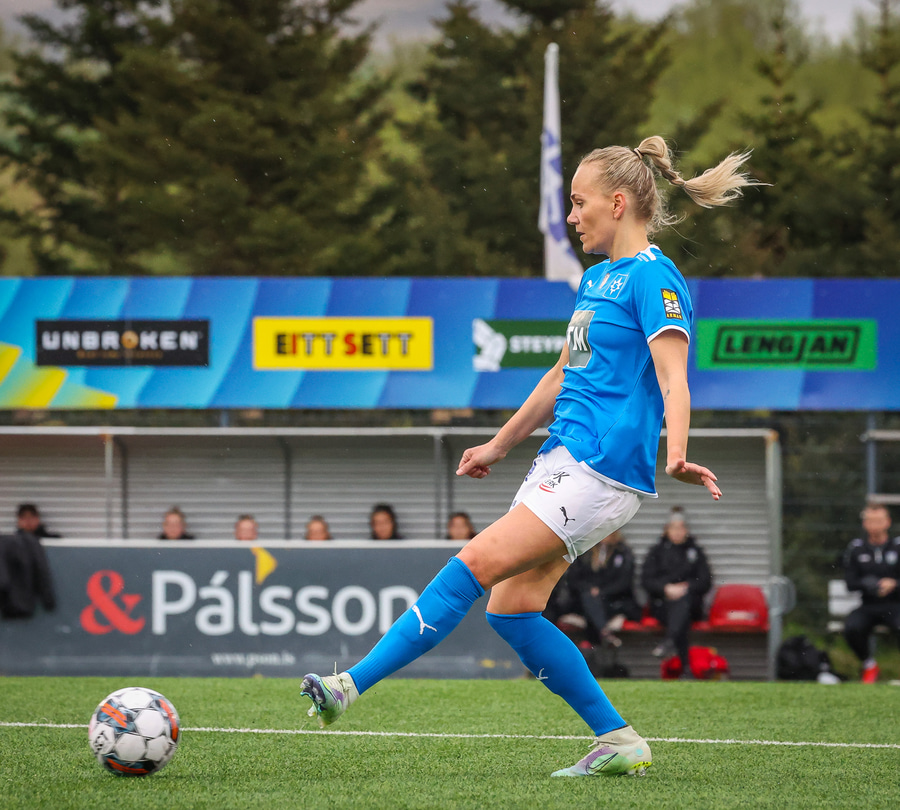 Katrín Ásbjörns með sendingu á Jasmín sem snýr af sér varnarmann en nær ekki skoti.