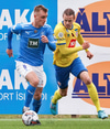 Nökkvi fær boltann við teig Stjörnunnar og á góða tilraun. Halli skutlar sér og ver til hliðar.