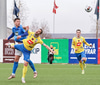 Ívar reynir að komast í boltann, varnarmaður Stjörnunnar skallar í burtu og Emil Atlason liggur eftir.