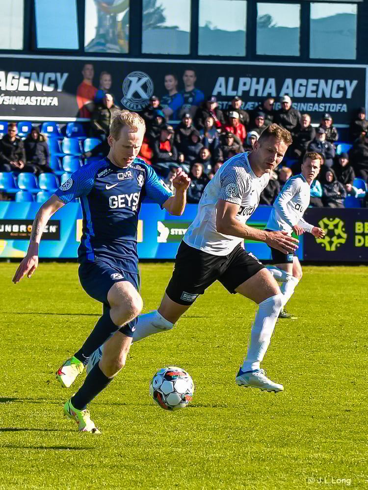 Kristinn Freyr að koma sér í álitlega stöðu inn á teig Keflavíkur en rekur hendina í andlit Ernis og dæmdur brotlegur.