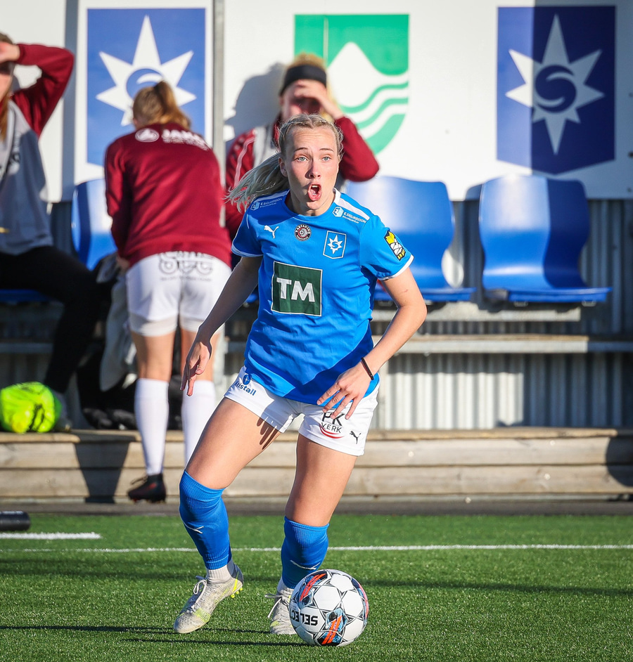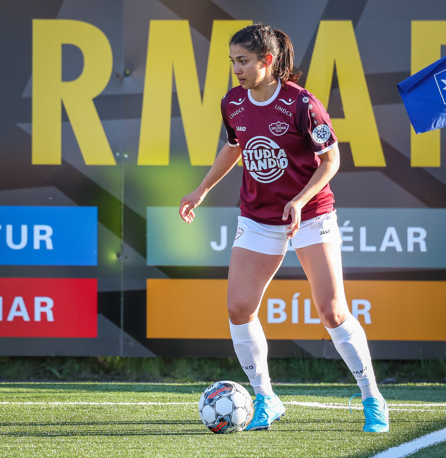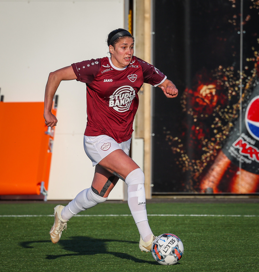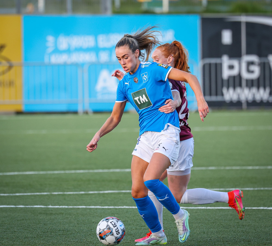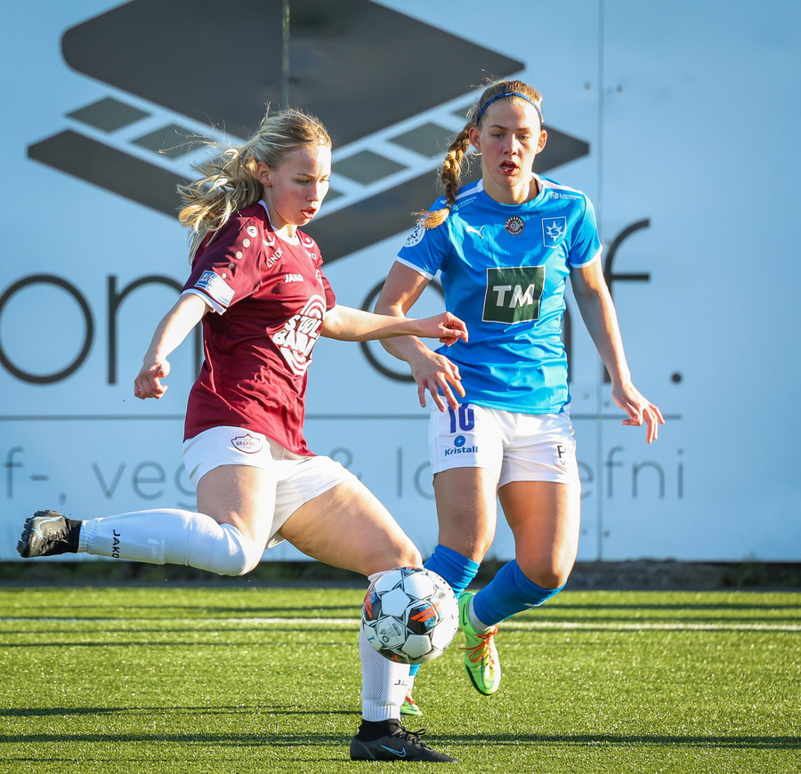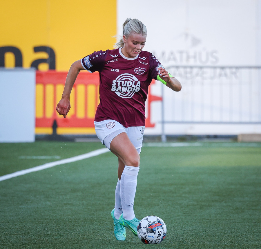 Barbára er kominn upp hægti kantinn á ferðinni reynir að komast fram hjá Sædísi en Sædísi á góða tæklingu og kemur boltanum frá.