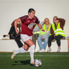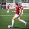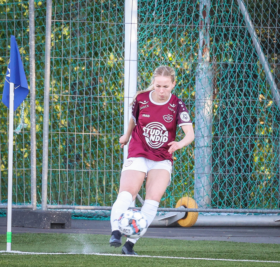 Katrín með boltann upp við hornfána og setur boltann í varnarmann Selfoss og út af í horn.