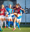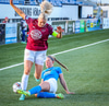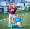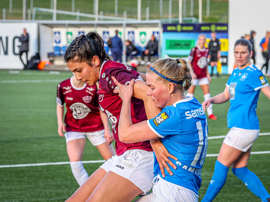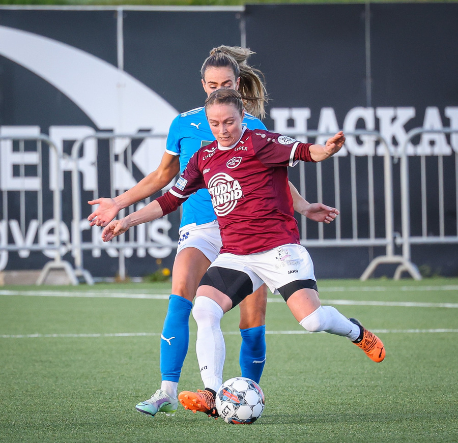 Gyða með fyrirgjöf beint í magann á Bergrósu, þetta hefur ekki verið þægilegt.