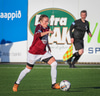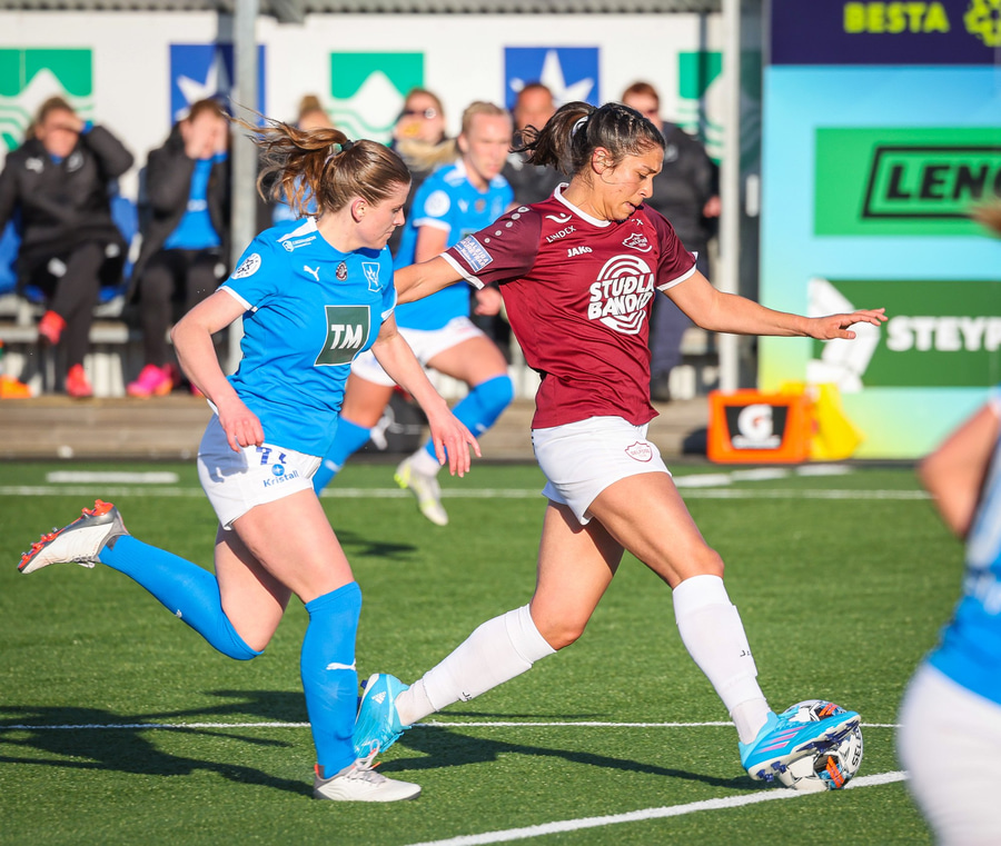 Miranda tekur fer fram hjá Heiðu Ragney, býr sér til pláss og á svo fínt skot sem fer rétt fram hjá.