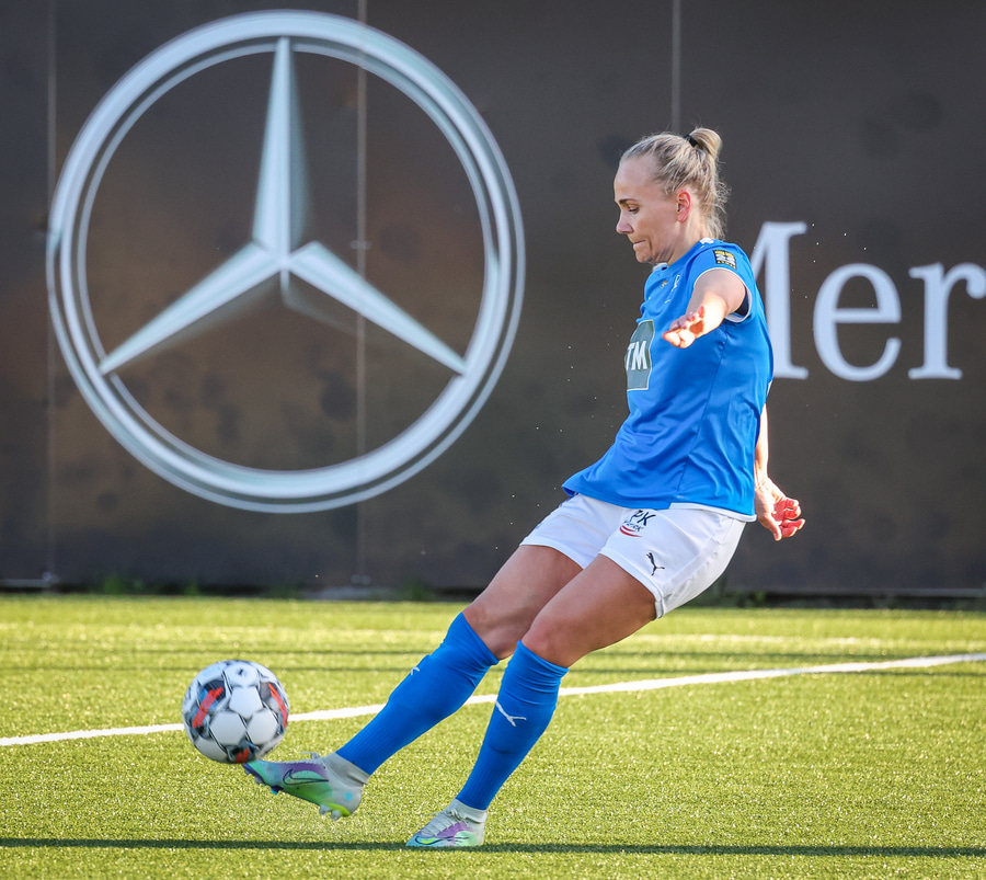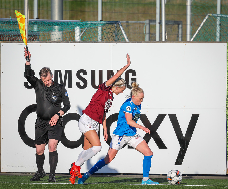 Eftir mikið klafs inni í teig Stjörnukvenna kemur Málfríður boltanum frá á Katrínu sem sendir boltann inn fyrir á Jasmínu sem er rangstæð.