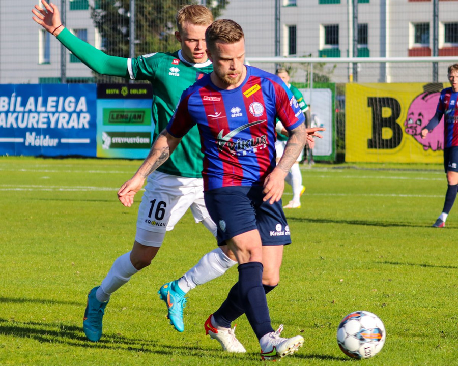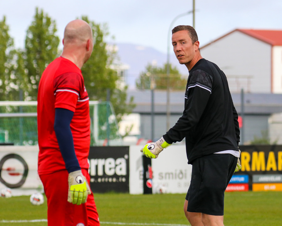 Róbert bætir upp fyrir klúðrið áðan. Dagur Austmann á góða fyrirgjöf fyrir og Róbert skallar boltann í netið. Birgir Baldvinsson reyndi einnig við boltann og hann og Róbert skölluðu hvorn annan við markið og lágu báðir eftir. Stóðu á lappir á endanum og geta haldið leik áfram.