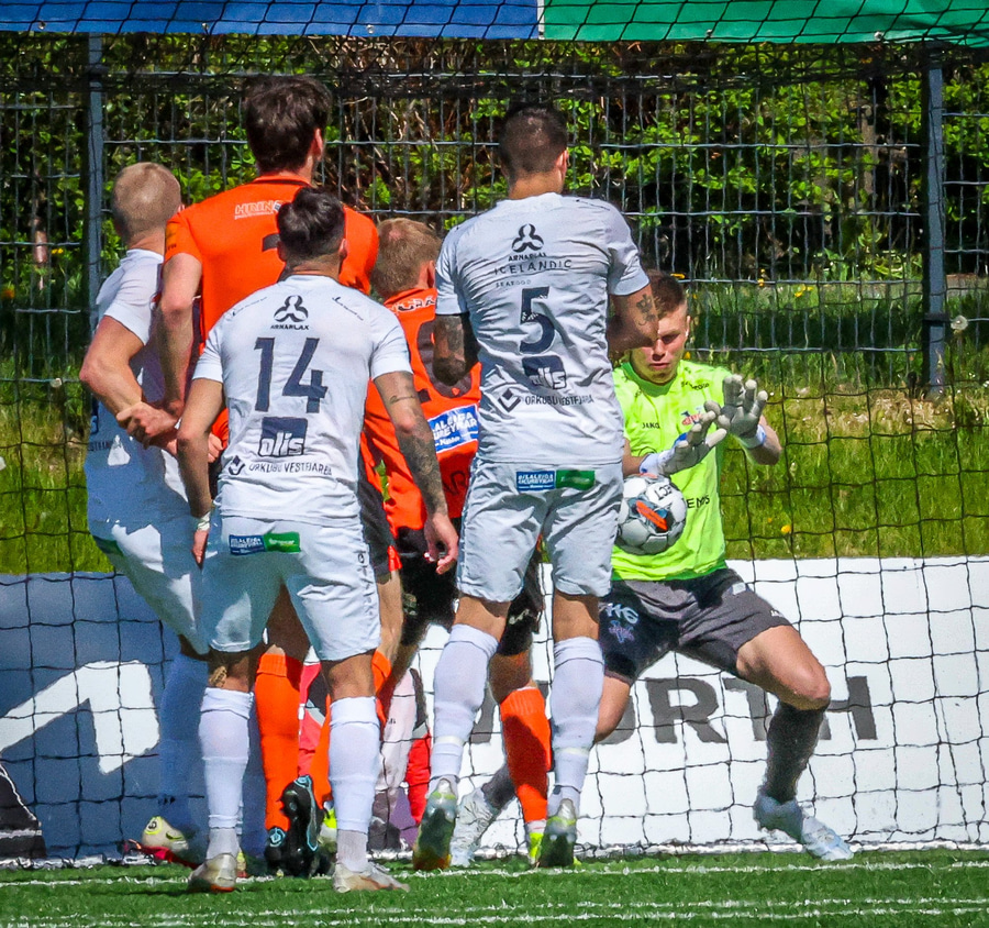 Deniz fær boltann við teiginn vinstra megin og nær skoti á nær en boltinn beint á Ólaf Kristófer.