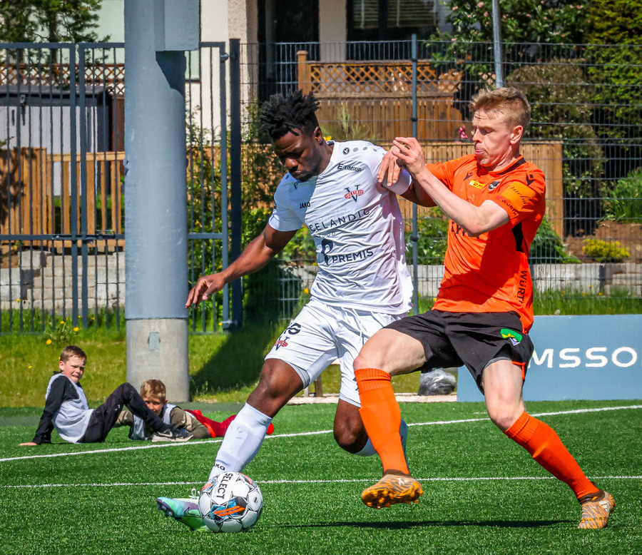 Fær boltann frá Ragnari Braga inn fyrir vörn Vestra og chippar boltanum yfirvegað yfir Marvin Darra.