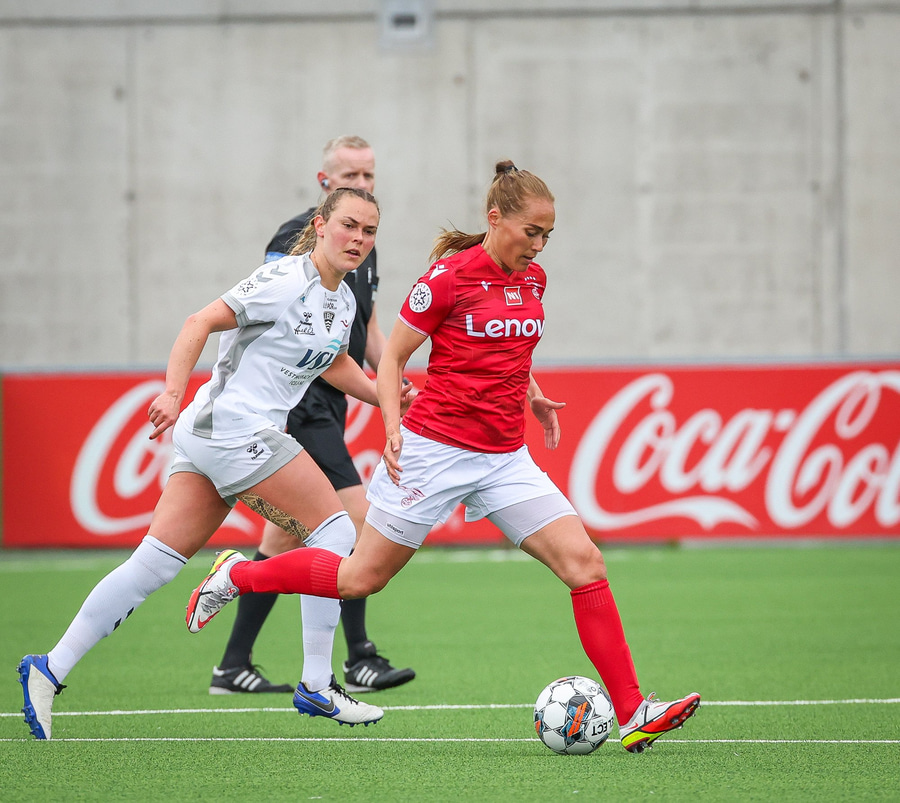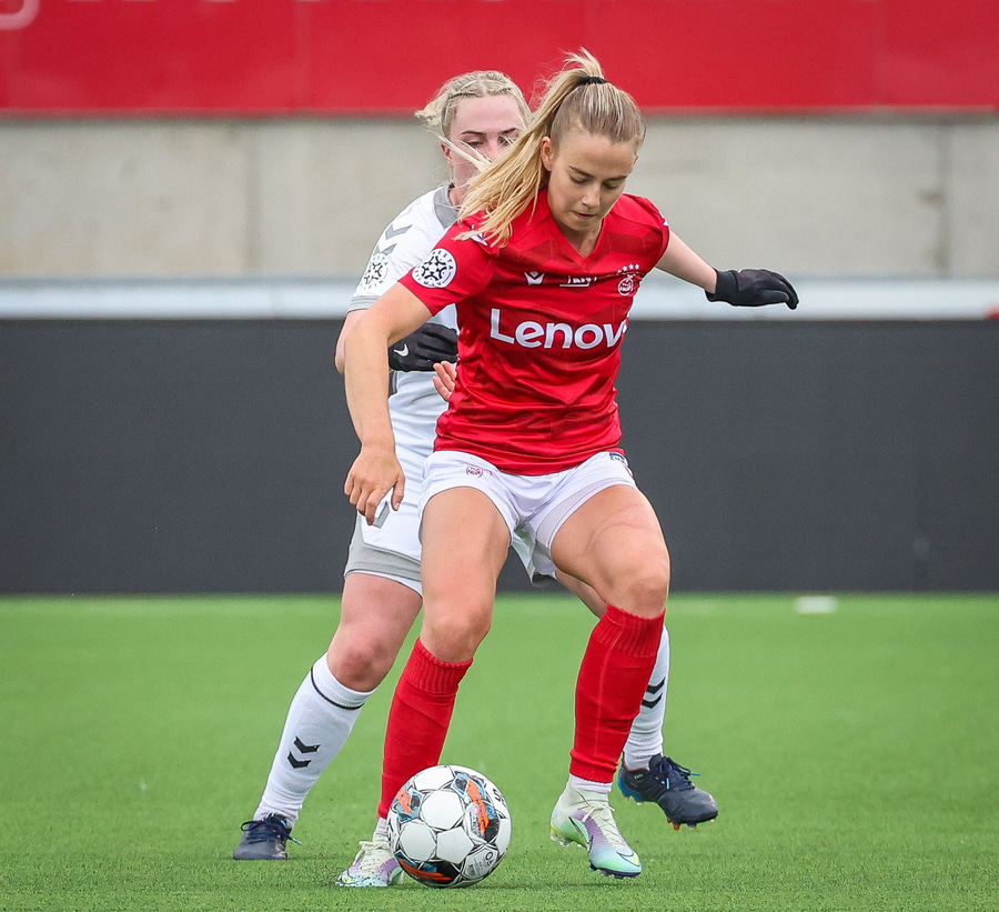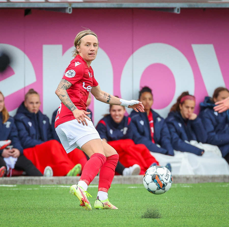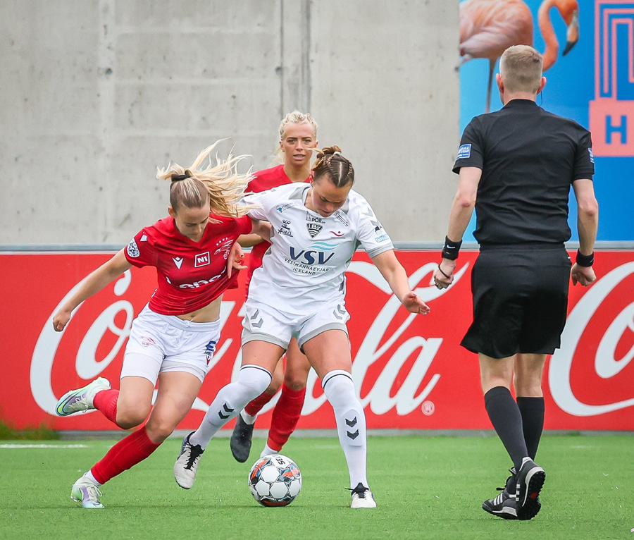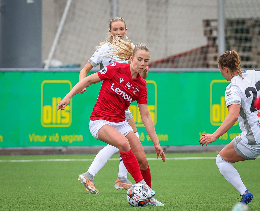 Olga kemst hér í gegn eftir hreinsun frá Júlíönu, tveir varnarmenn í Olgu en hún keyrir inn á hægri og á skot sem fer rétt svo yfir samskeytin. Olga gerði þetta frábærlega!
