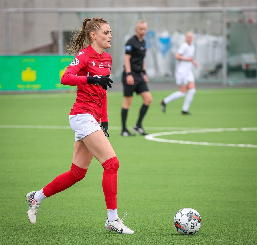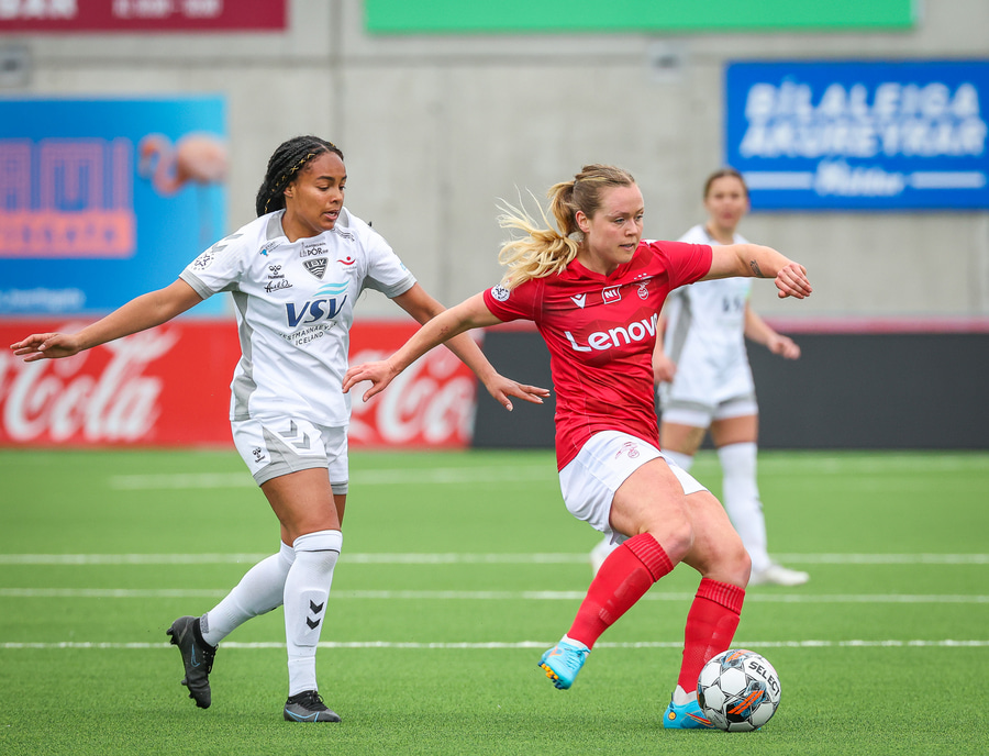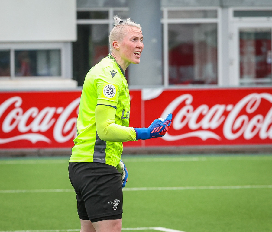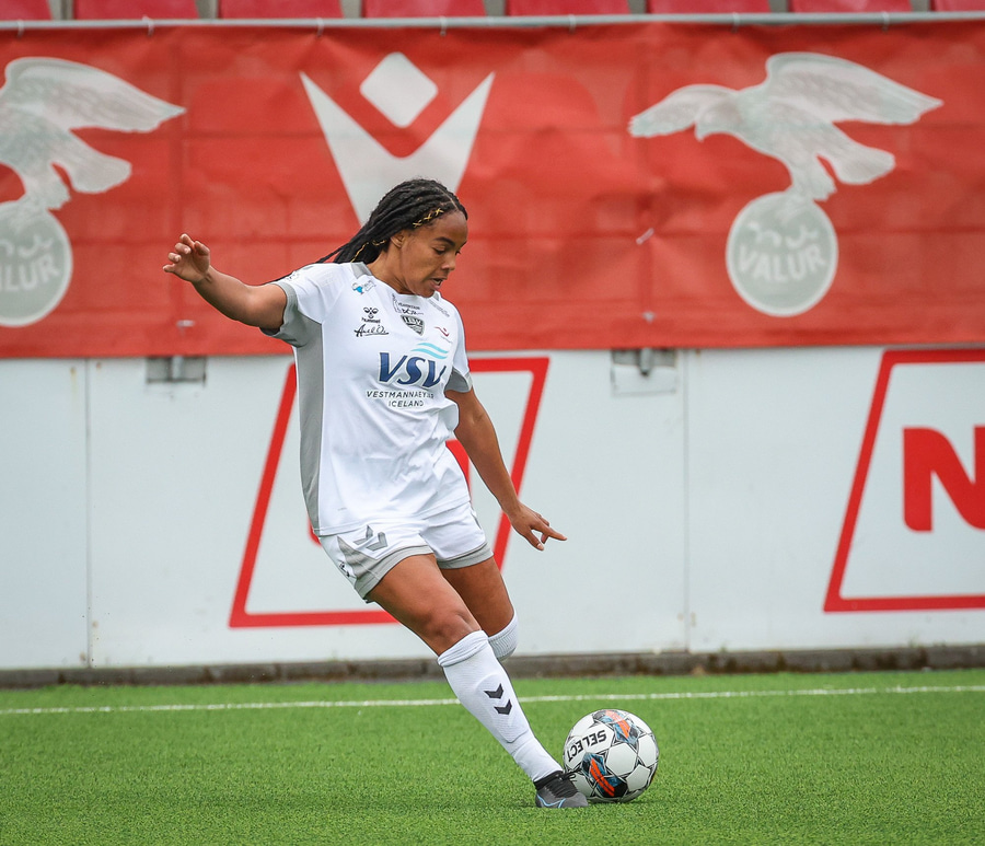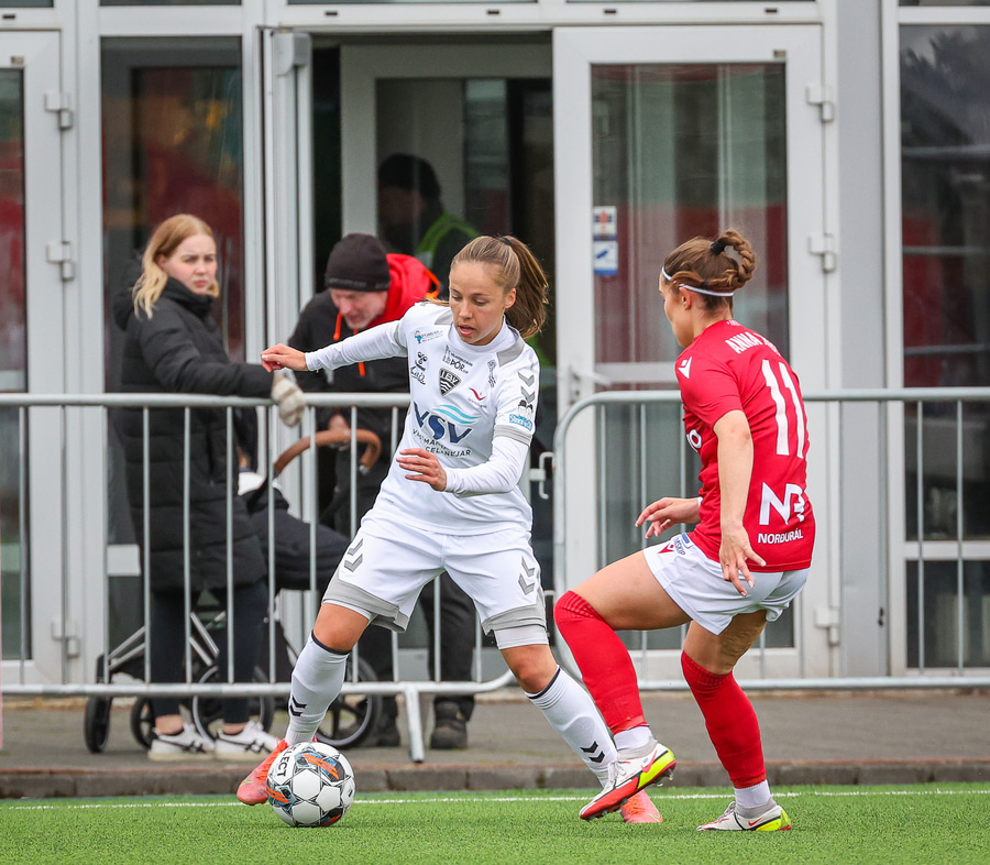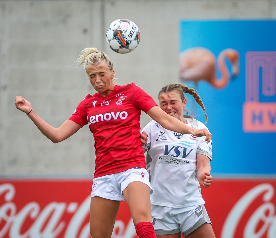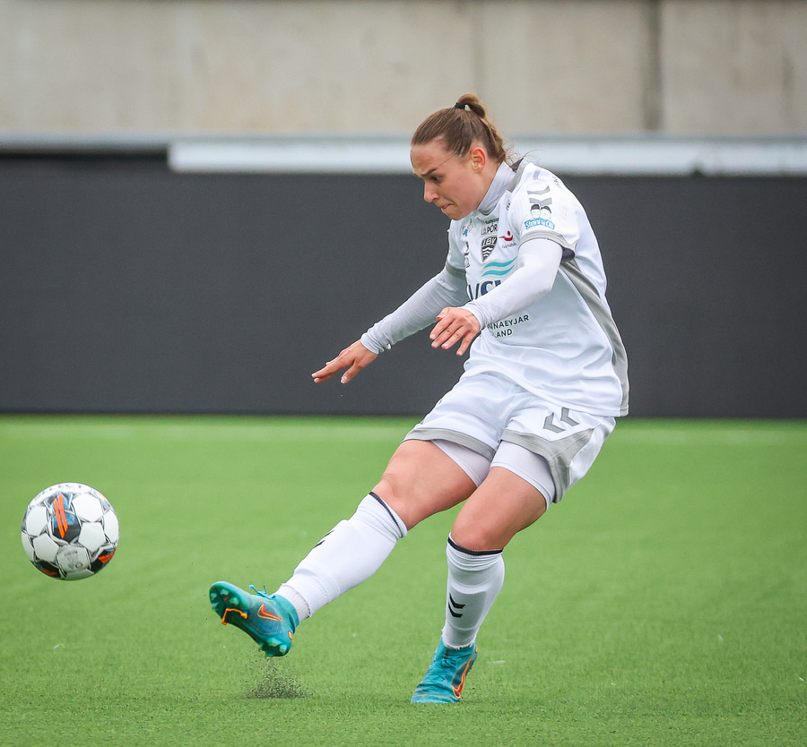 Brookelynn á hér fínasta skot fyrir utan teig en Guðný ver vel í marki gestanna.