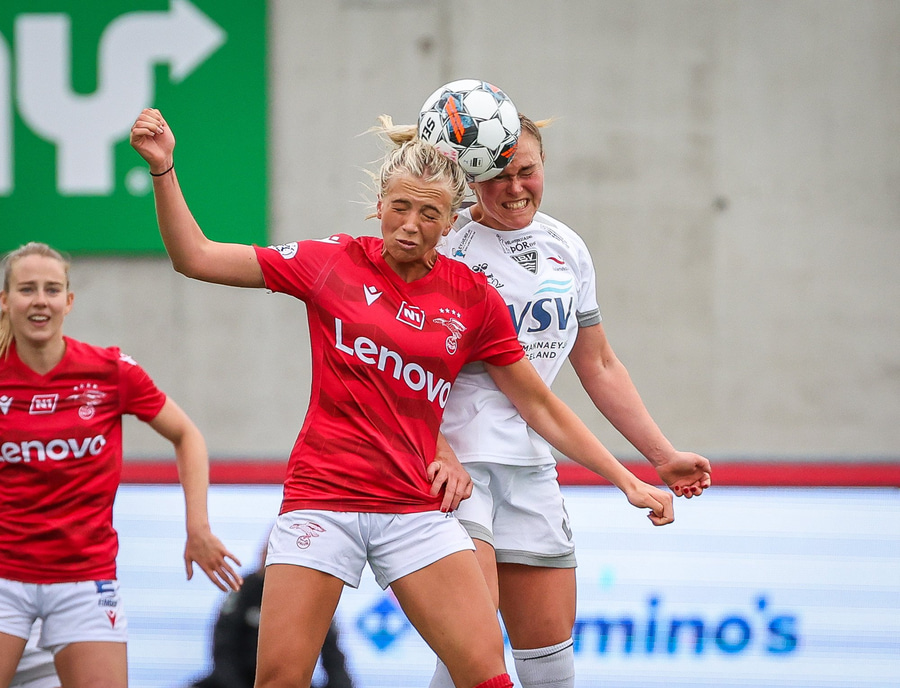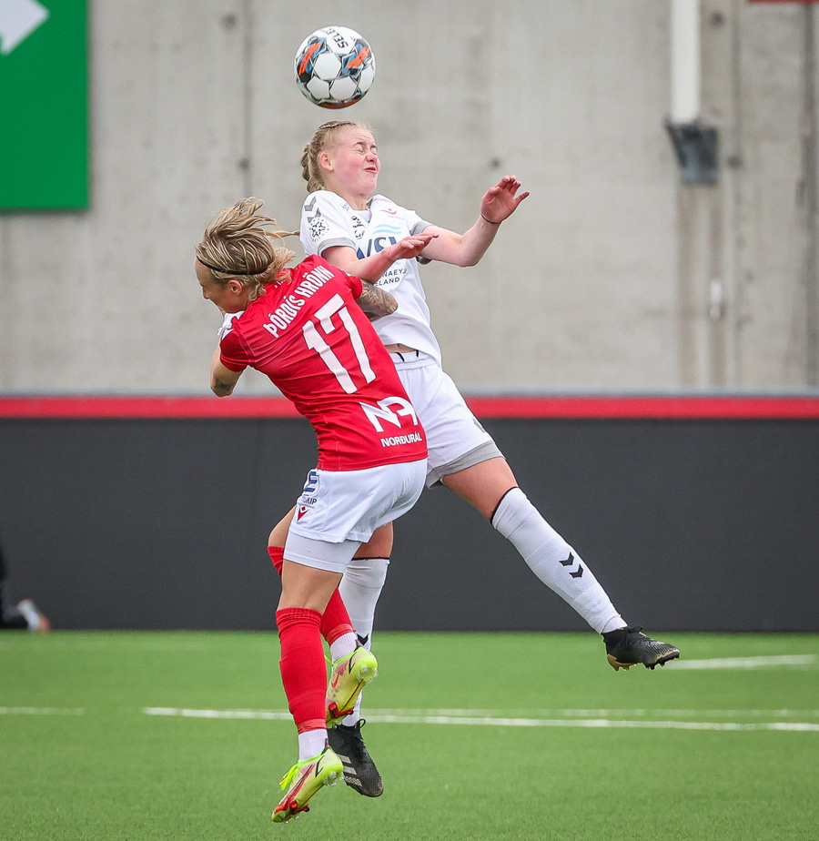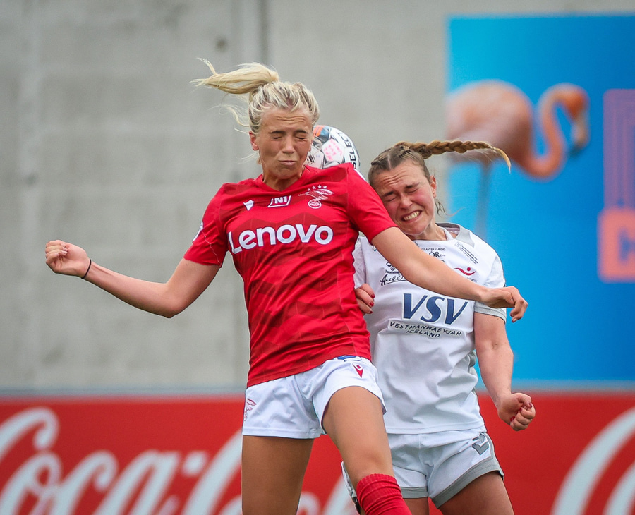 Ásdís tekur hornið og Ída nær kröftugum skalla sem nánast sleikir stöngina. Þarna mjóaði munu!