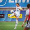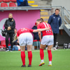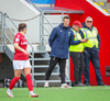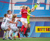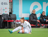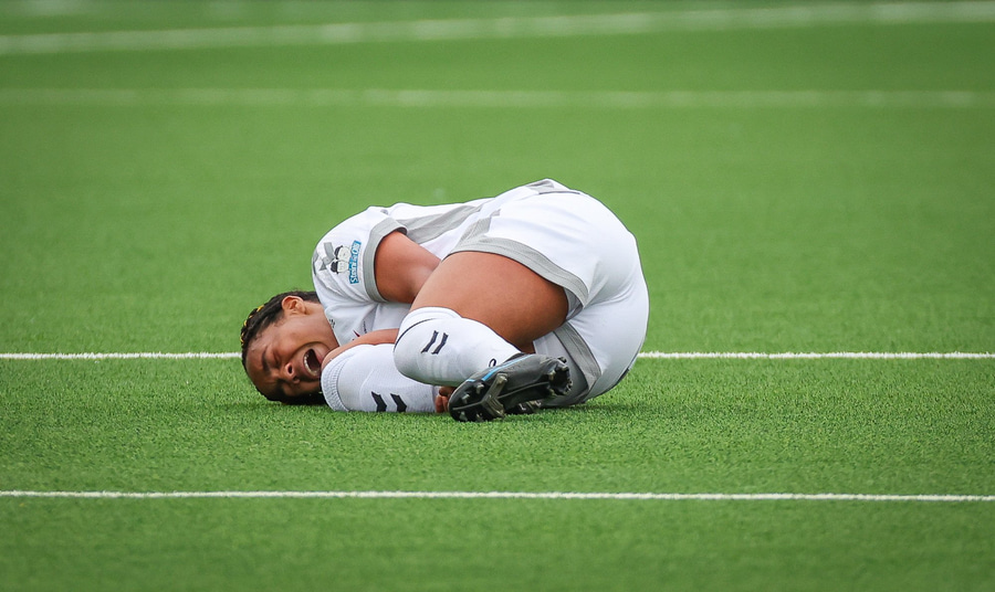 Haley Thomas lá niðri eftir baráttu í horninu Haley er nú staðin upp og leikurinn heldur áfram.