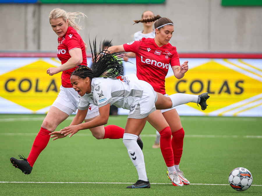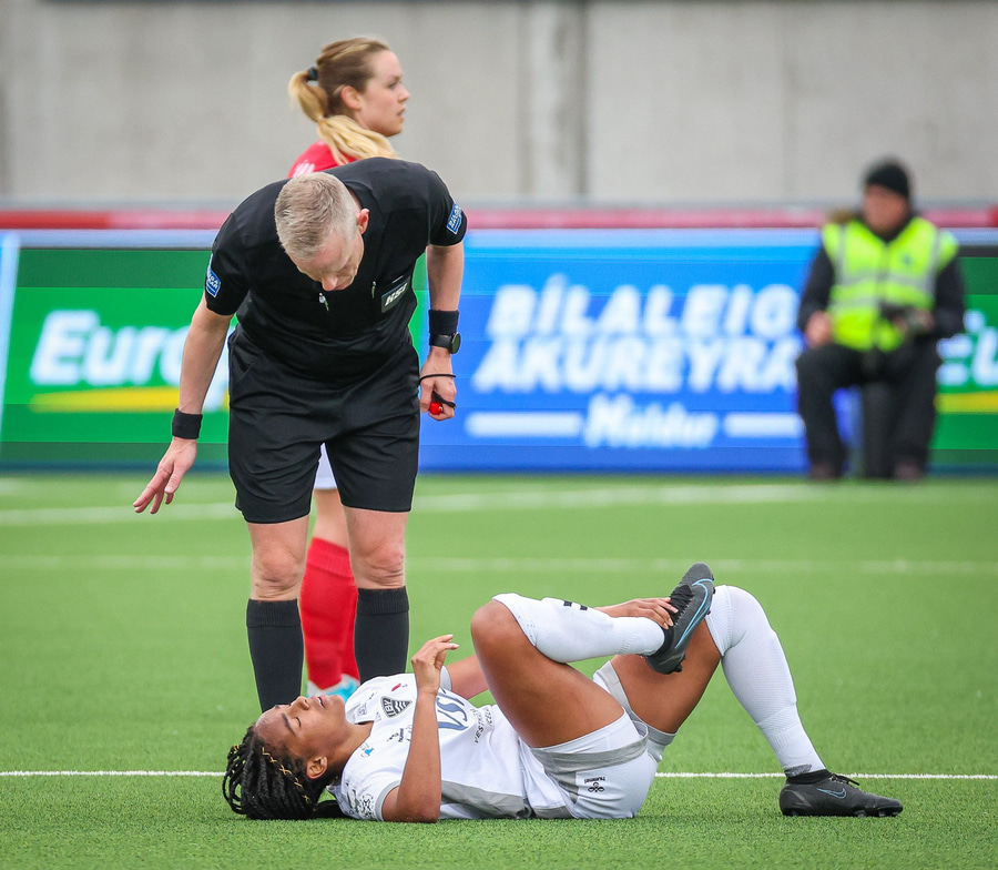 Mist fær hér gult spjald fyrir að taka Olgu niður.