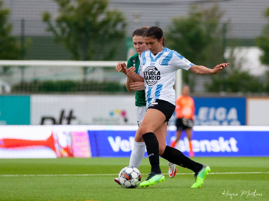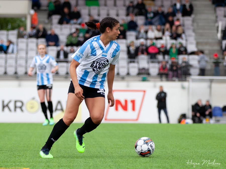 Fær boltan með bakið við Ástu Eir, lætur boltann fara í gegnum klofið á sér og Ástu og keyrir upp kantinn.