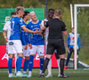 Tiago fór auðveldlega niður fyrir utan teig. Framarar í stúkunni baula og vilja aukaspyrnu en Elvis hreinlega skammar Tiago fyrir dýfu.