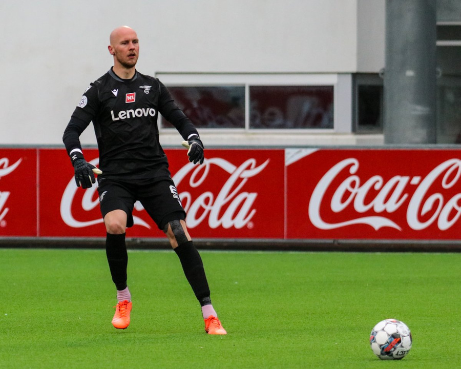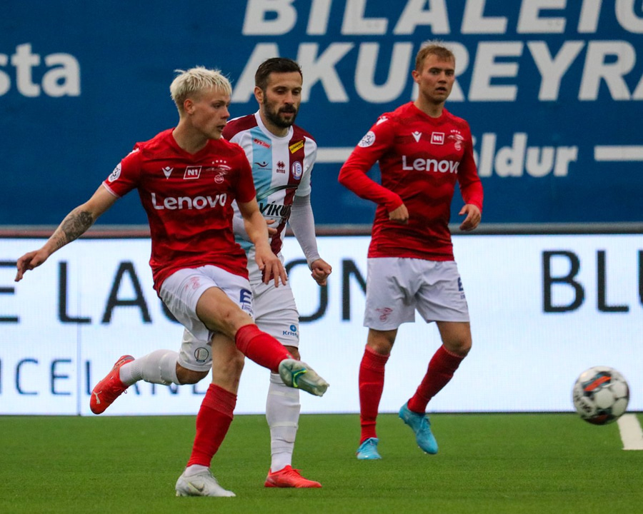 Jakobsen finnur Bjarka á fjærstönginni en fyrirliðinn er truflaður og ekkert kemur upp úr þessu.