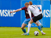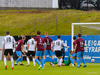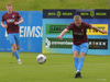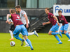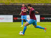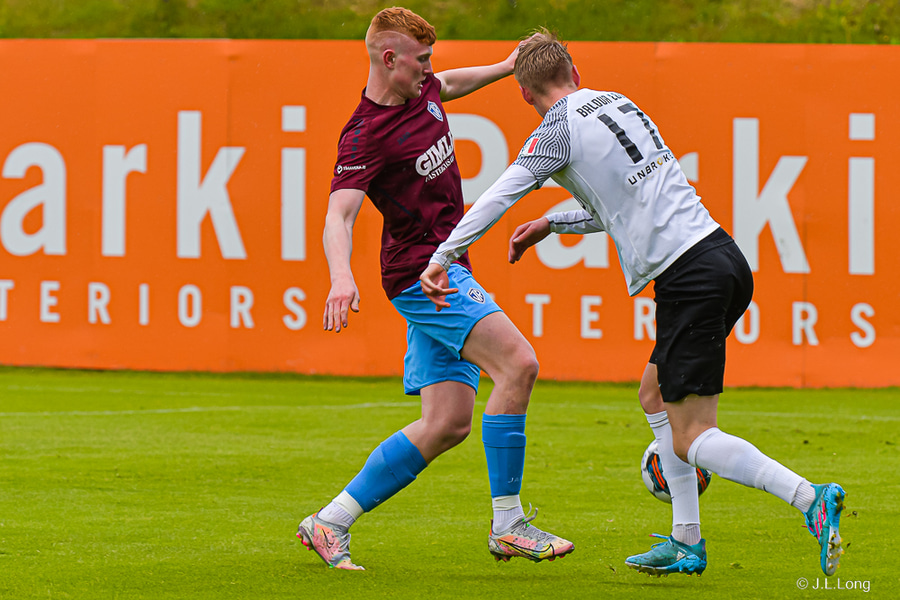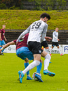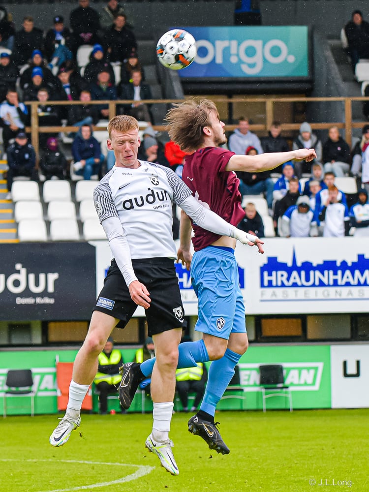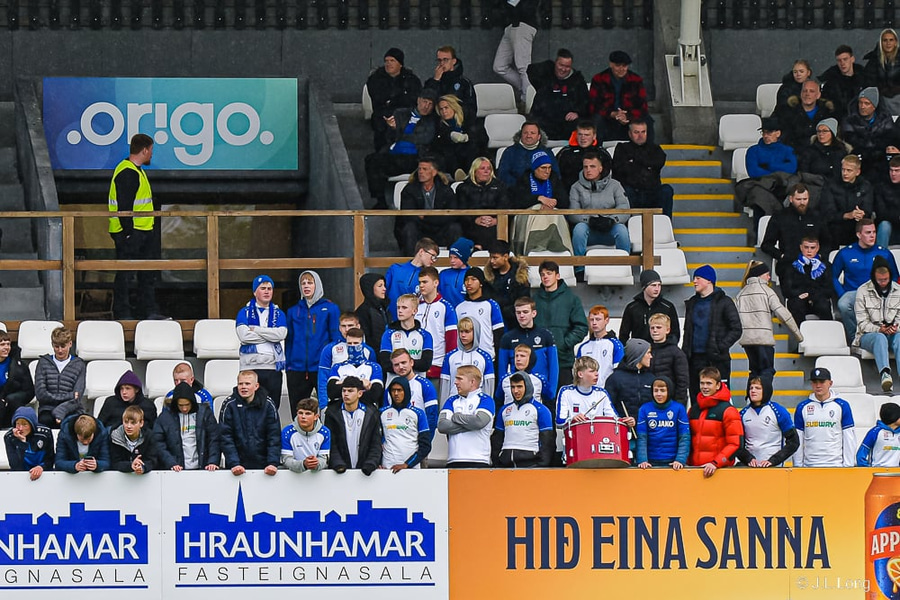 Nettur West Ham fílingur í varabúningunum hjá ÍR. Ljósbláar stuttbuxur og vínrauð treyja.. FH í sínum hefðbundnu hvítu treyjum og svörtum stuttbuxum
