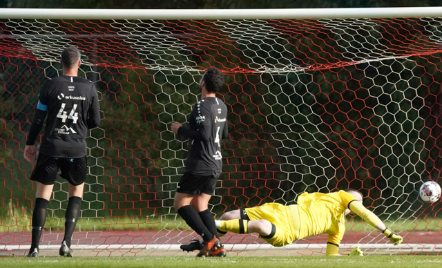 Harley Willard skorar úr vítaspyrnunni! Þórhallur velur rétt horn en boltinn vel út við stöng.