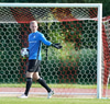 KV fékk hér aukaspyrnu, fyrirgjöfinn beint á kollinn á leikmanni KV sem skallar boltann beint í fangið á Aroni.