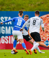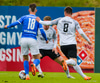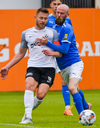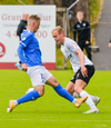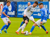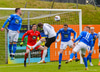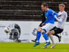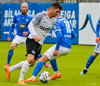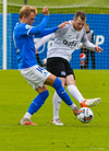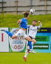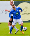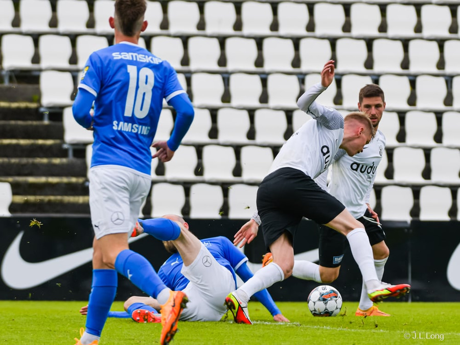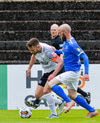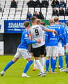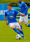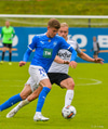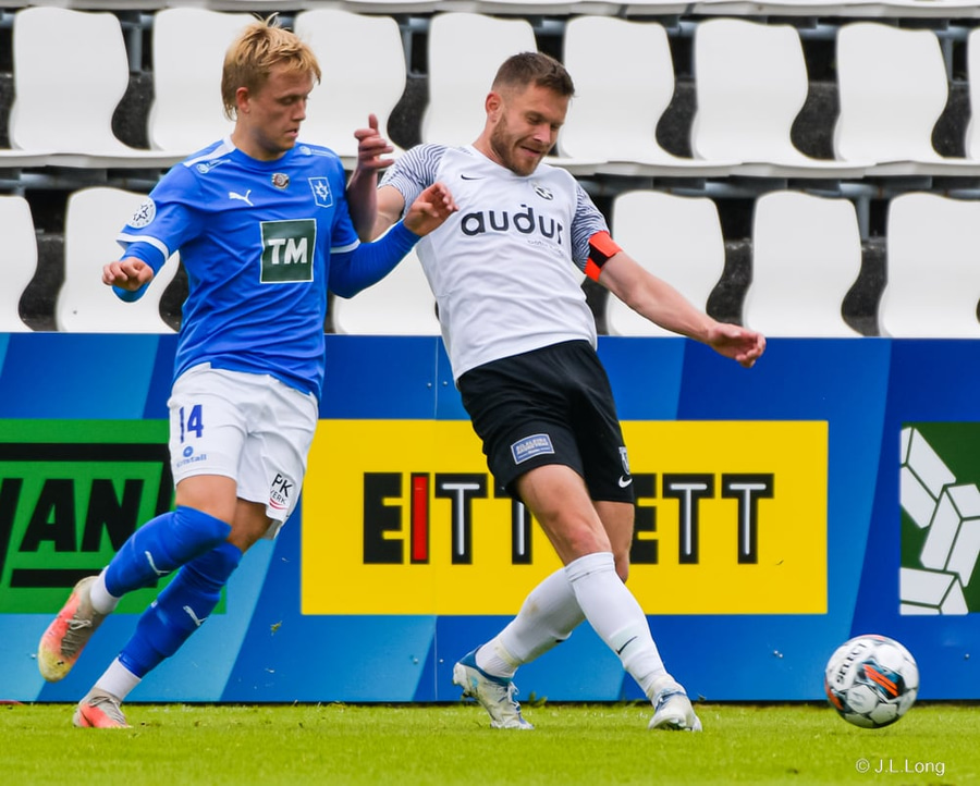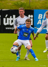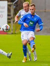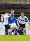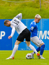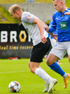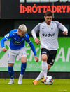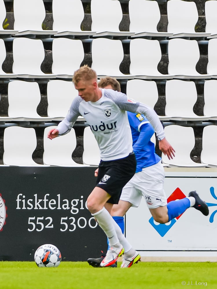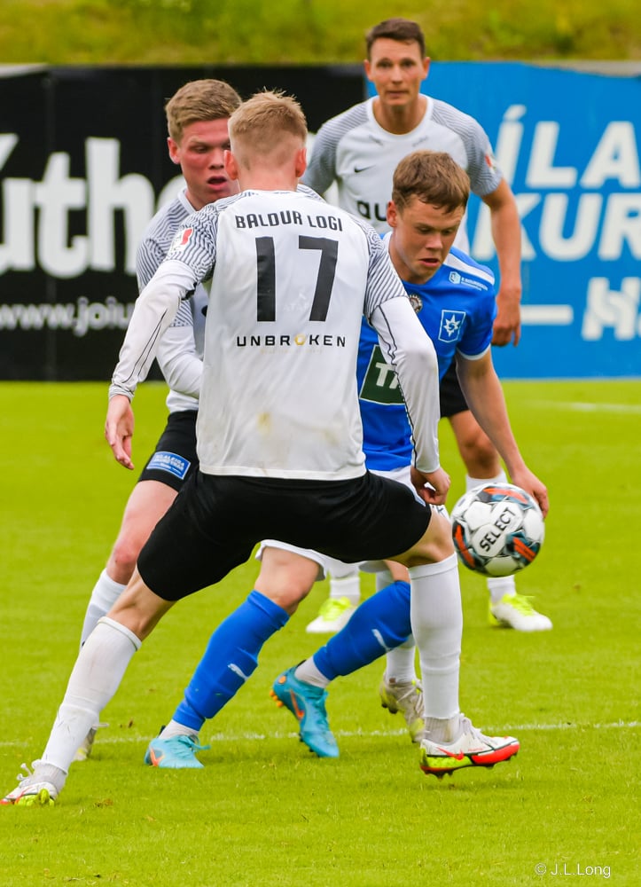 Björn Daníel þræðir boltan í gegnum vörn gestana þar sem Baldur er á undan Haraldi í boltann og er þá kominn með opið mark fyrir framan sig.