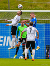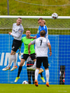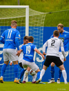 Hornspyrna frá Stjörnunni sem Gunnar ætlar að grípa en hann missir boltann og þá berst hann út í teig þar sem Adolf dúndrar boltanum upp í þaknetið.