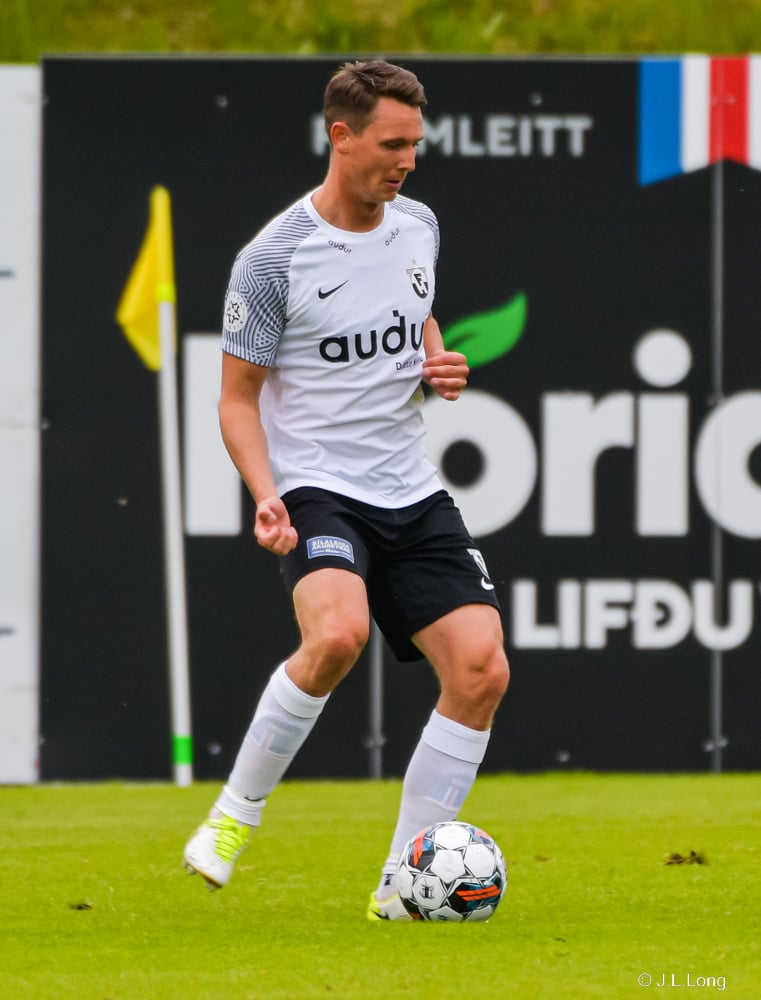 Lennon með skotið fyrir utan teig en hittir hann ekki alveg og fer því frekar laust á Halla.