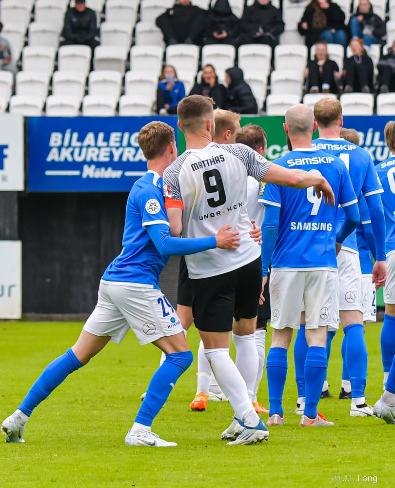 Það er að færast alvöru harka í leikinn menn að taka vel á hvor öðrum en nú liggur Björn Berg eftir og þarfnast aðhlynningu.