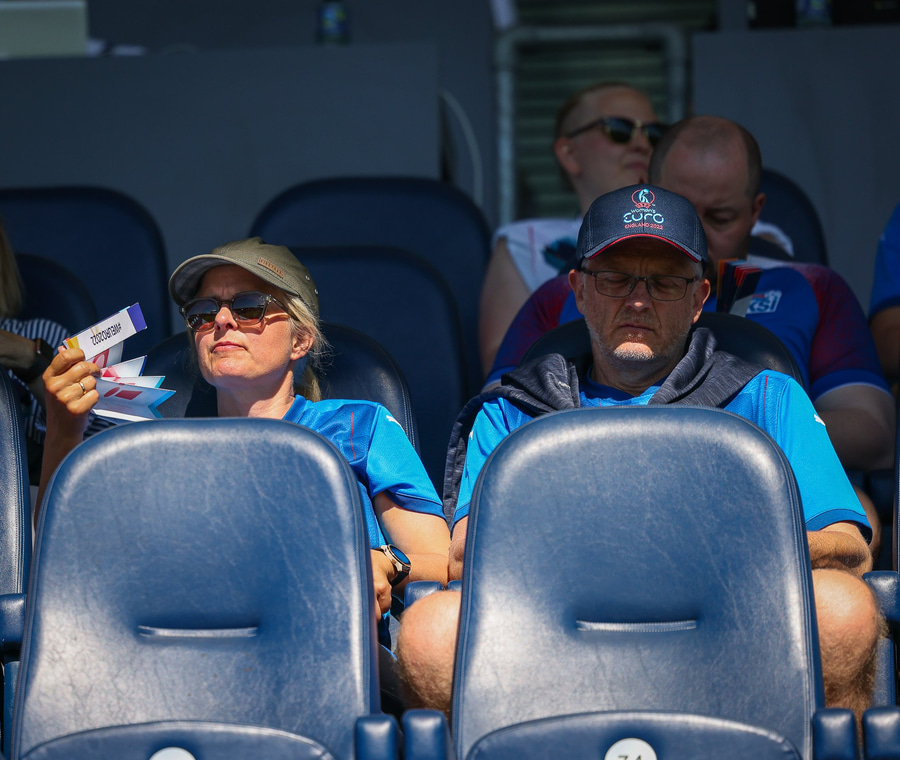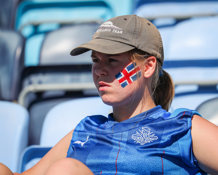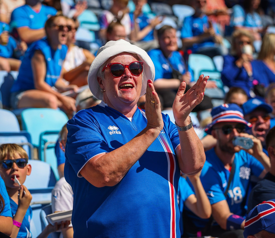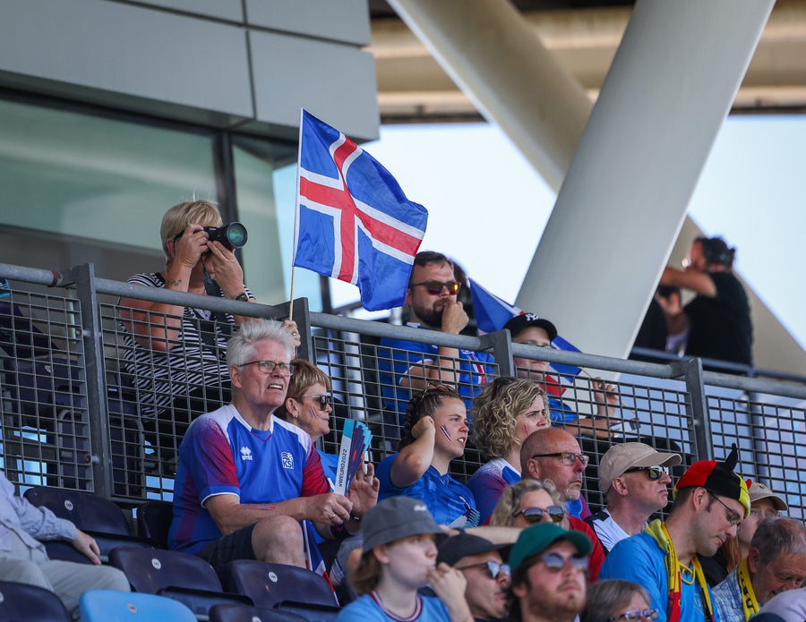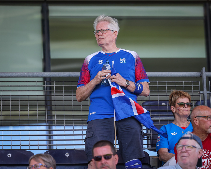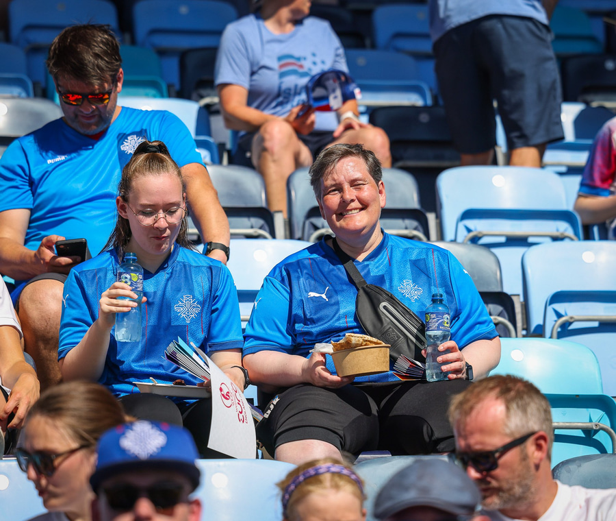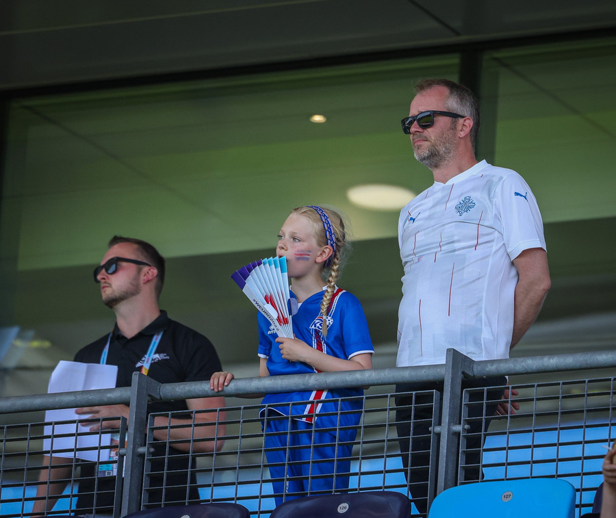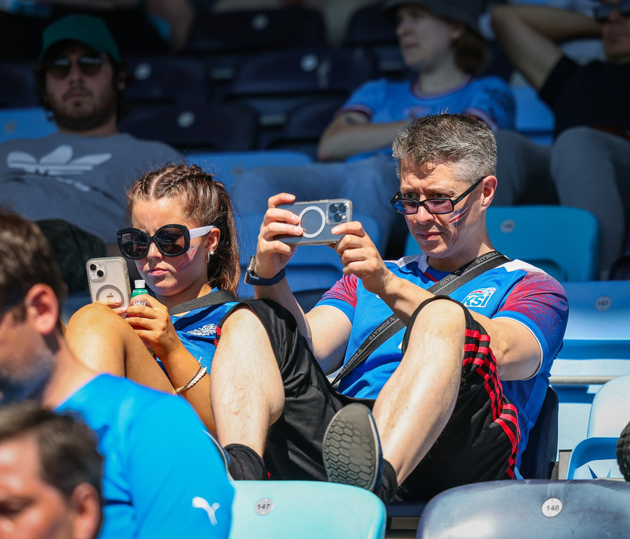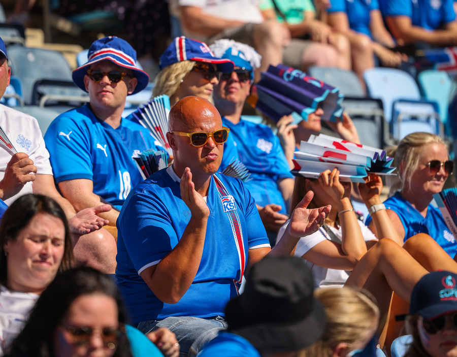 Stuðningsmenn Íslands eru byrjaðir að koma sér fyrir á vellinum og vallarþulurinn minnir fólk á að vera duglegt við að drekka vatn og bera á sig sólarvörn.