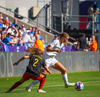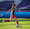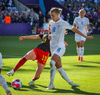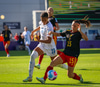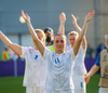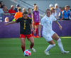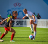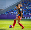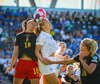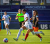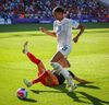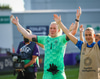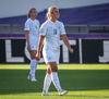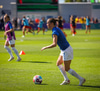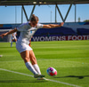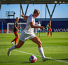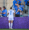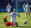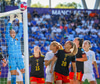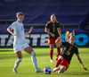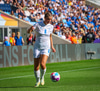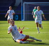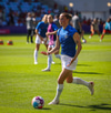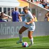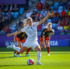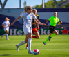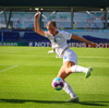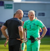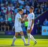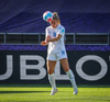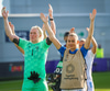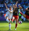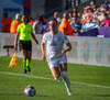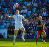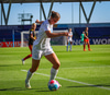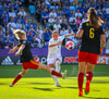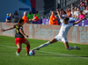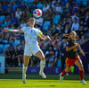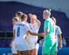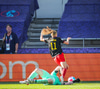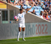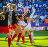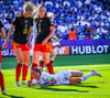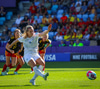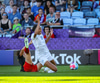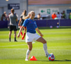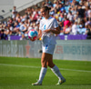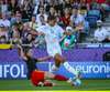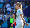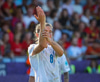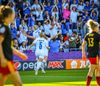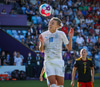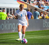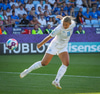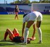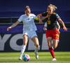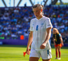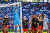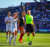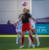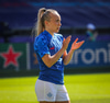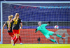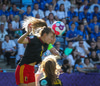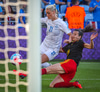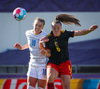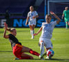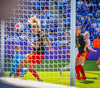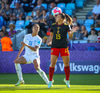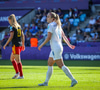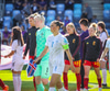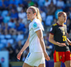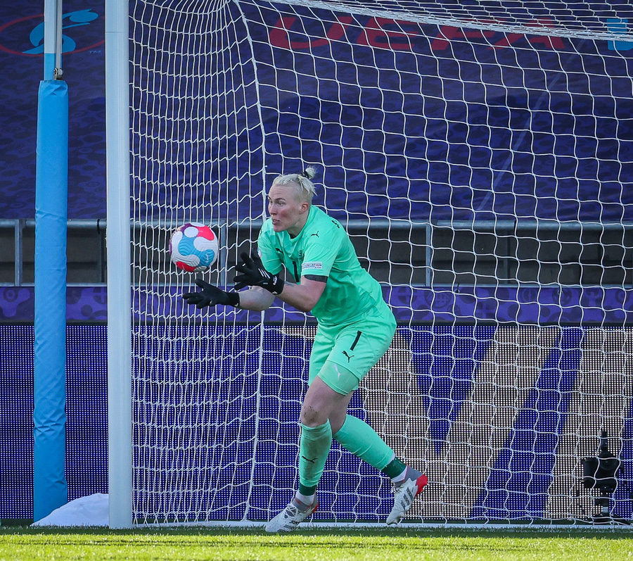 Góð spyrna frá Karólínu sem Dagný skallar að marki en Evrard nær að blaka yfir!