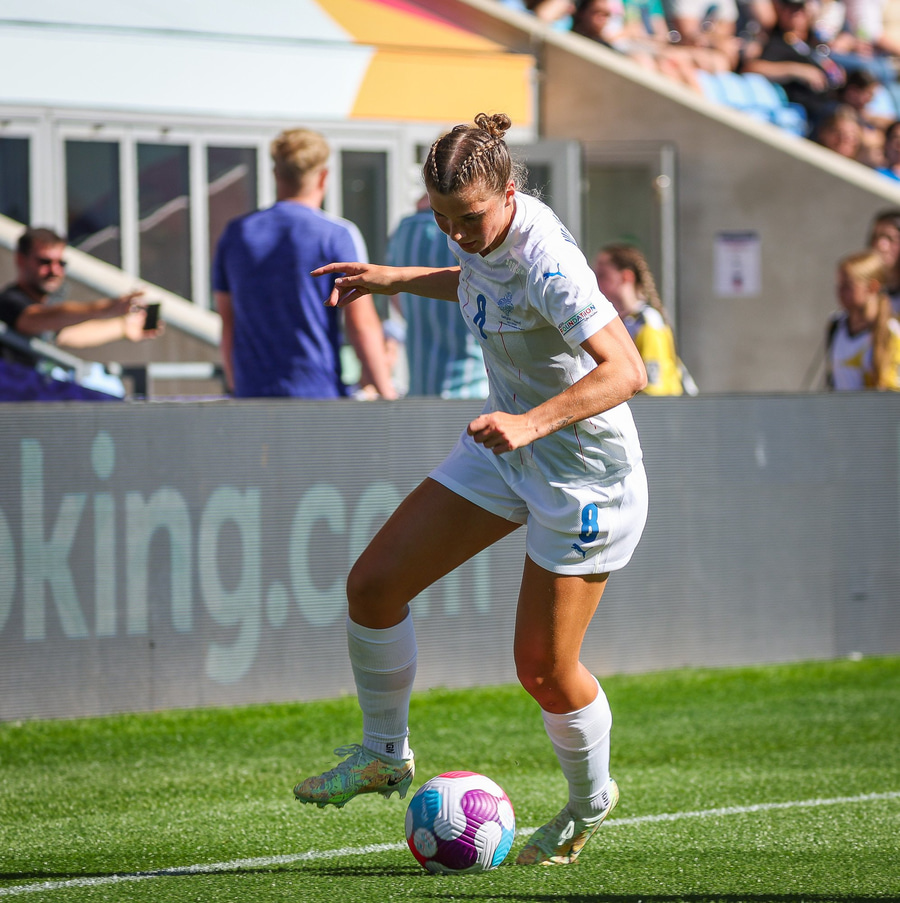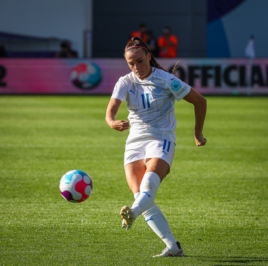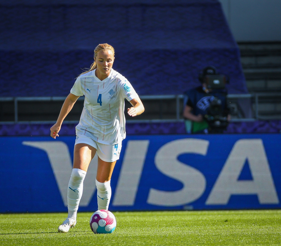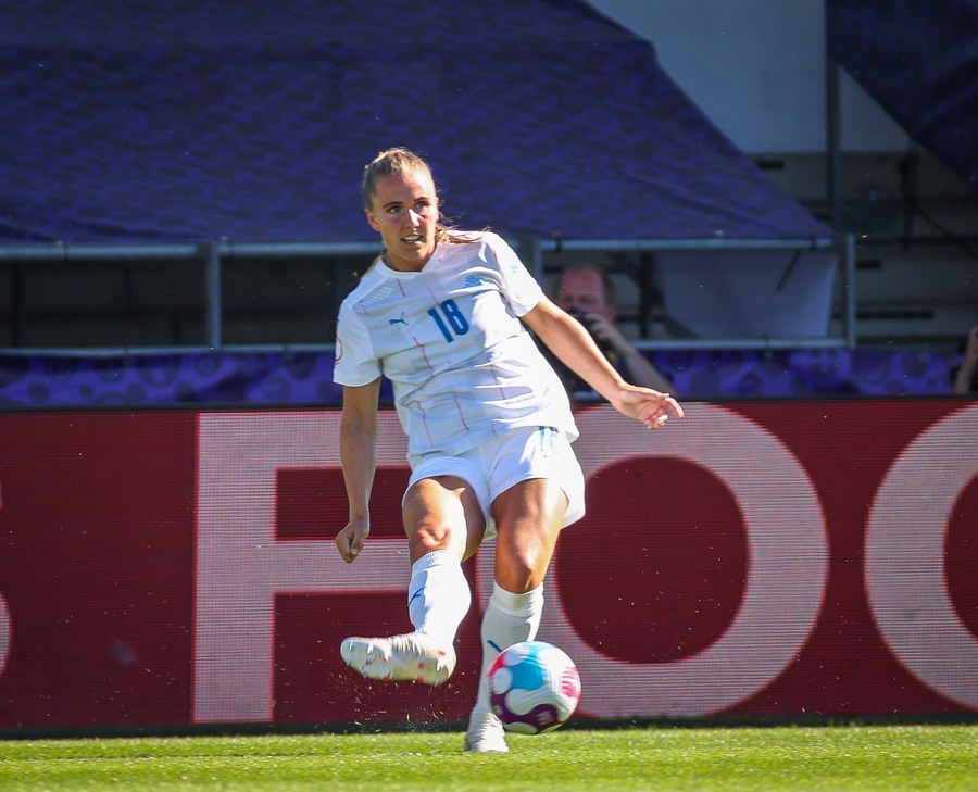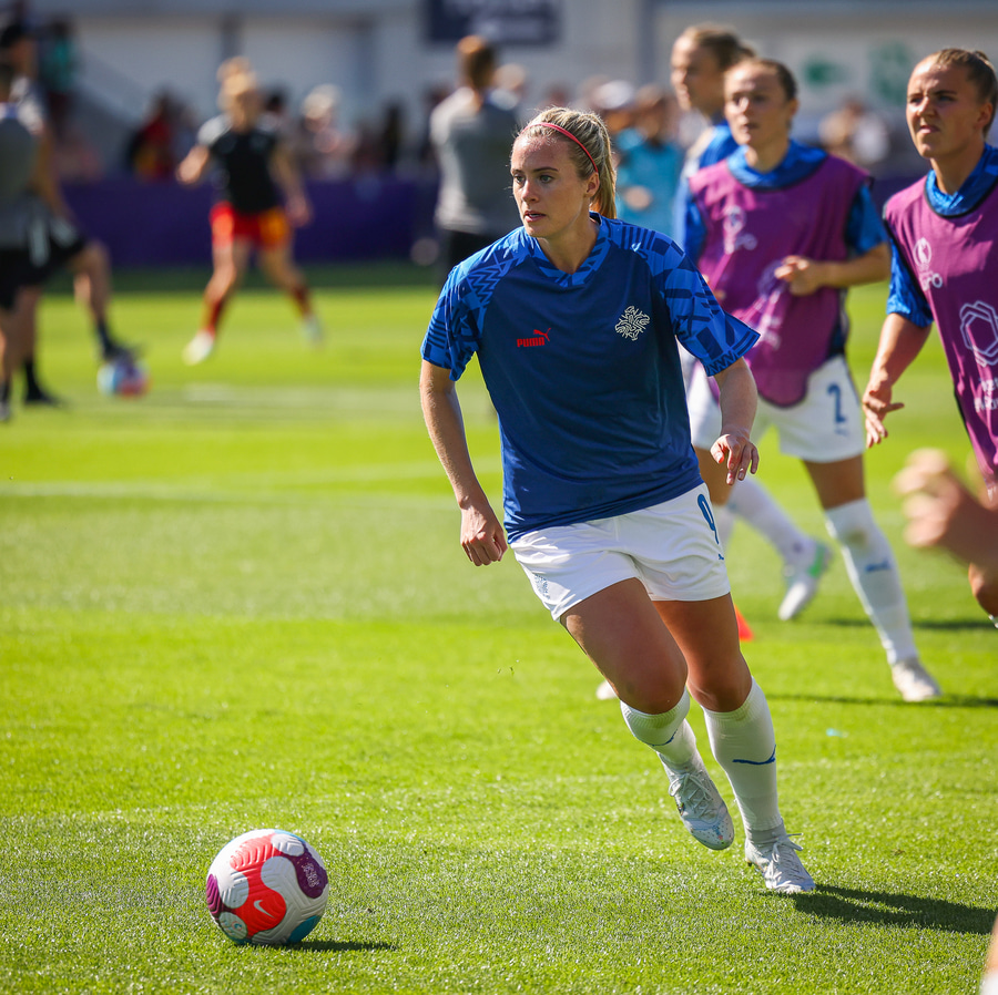 Berglind Björg tekur upphafsspyrnuna, Ísland byrjar með boltann!