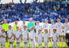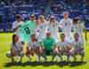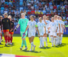 Eins og ég sagði áðan þá spilar Ísland í hvítum treyjum og belgíska liðið er í svörtum treyjum og rauðum stuttbuxum.