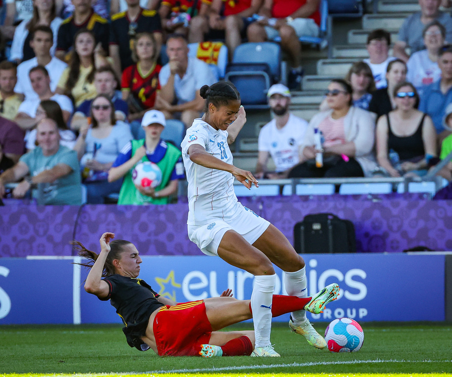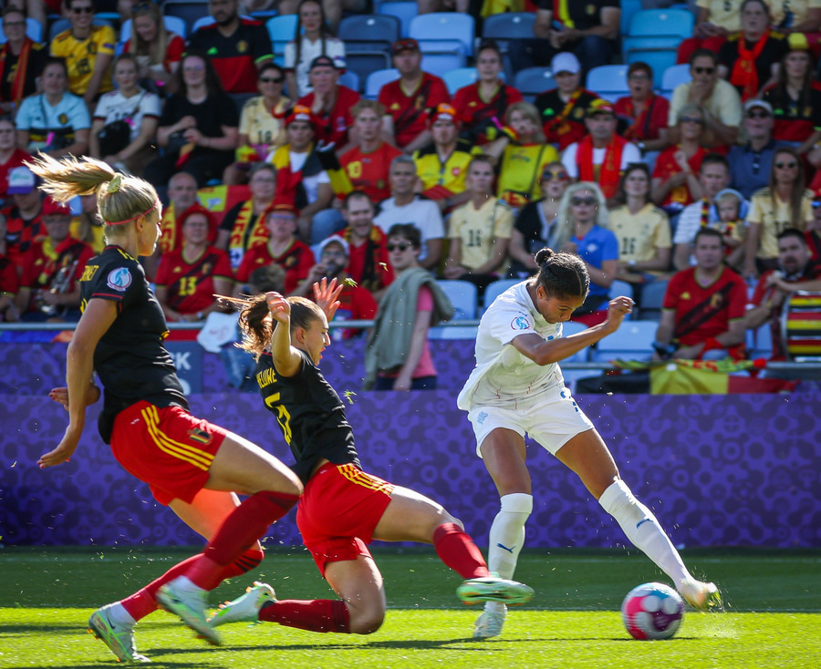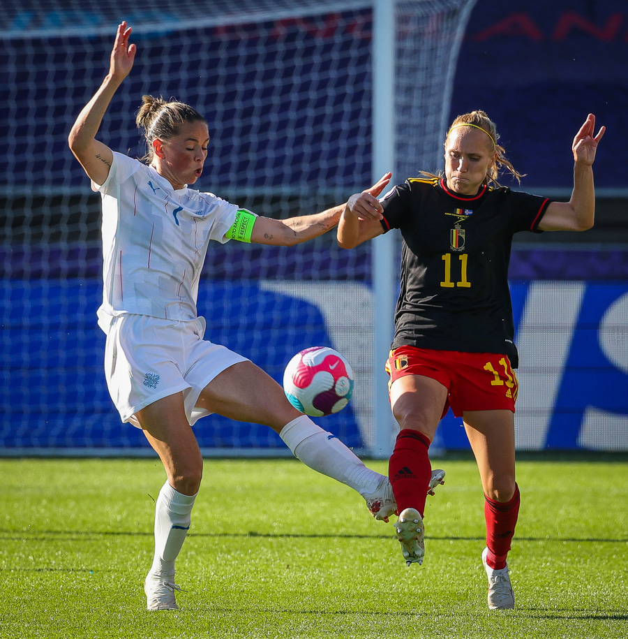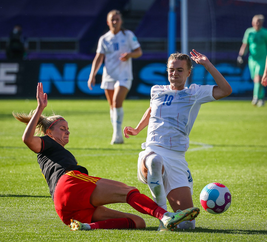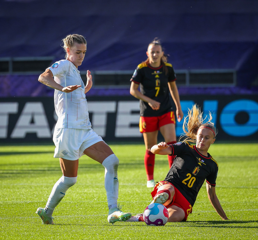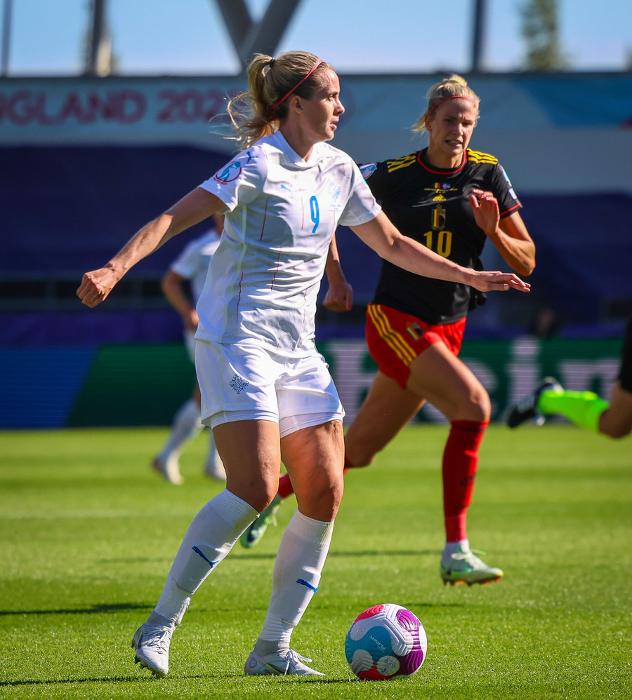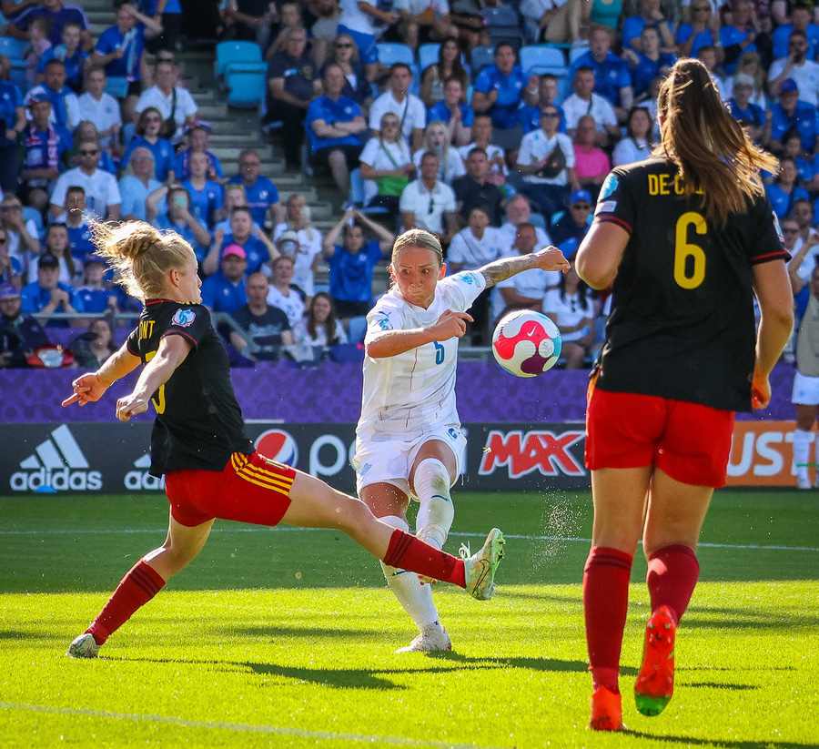 Skeiðar upp allan vallarhelming Belgíu og rúmlega það, stendur af sér eina tæklingu og kemst framhjá tveimur varnarmönnum. Hún á svo skot með vinstri fæti sem Evrard ver með sínum vinstri fæti og Ísland á horn.
