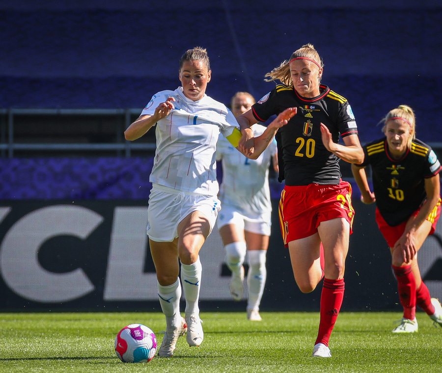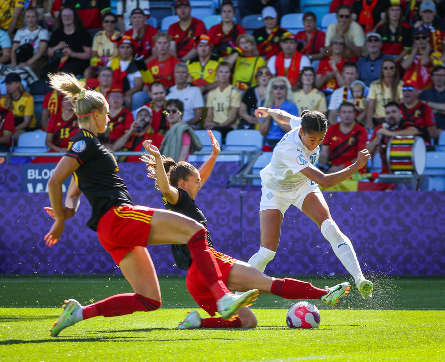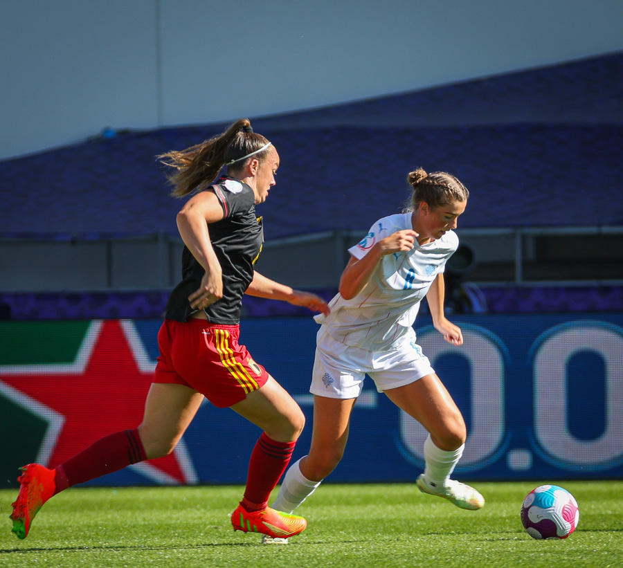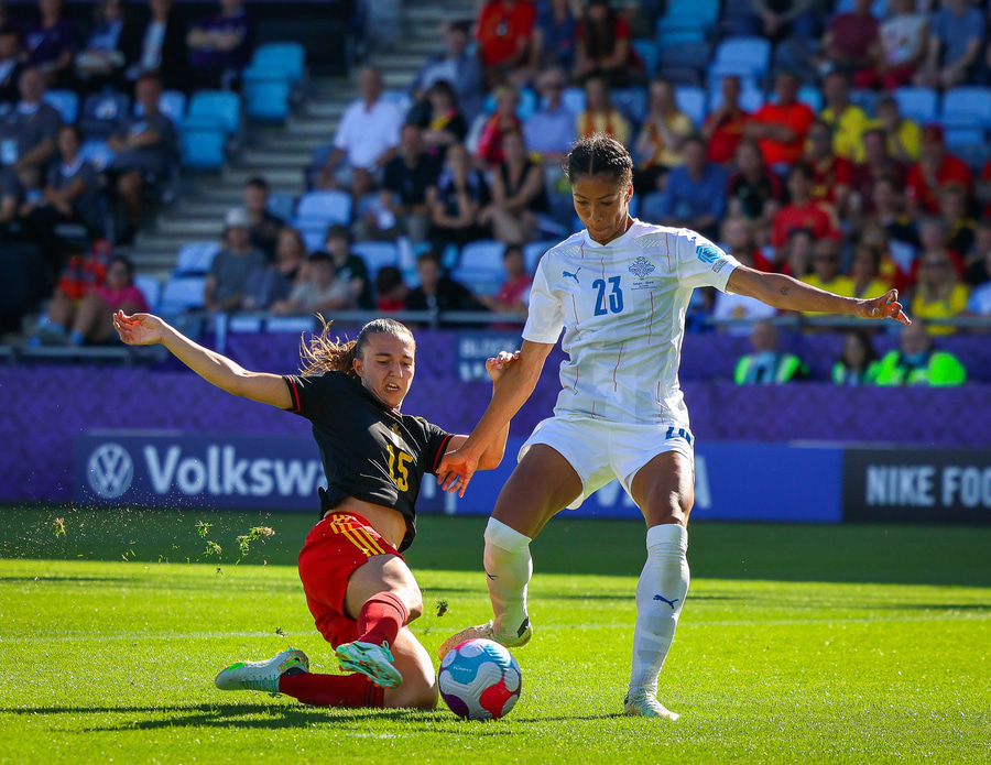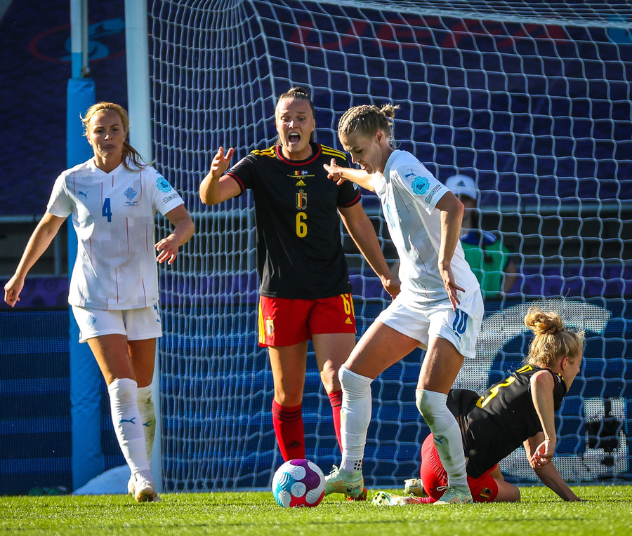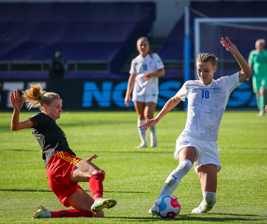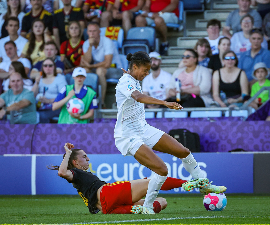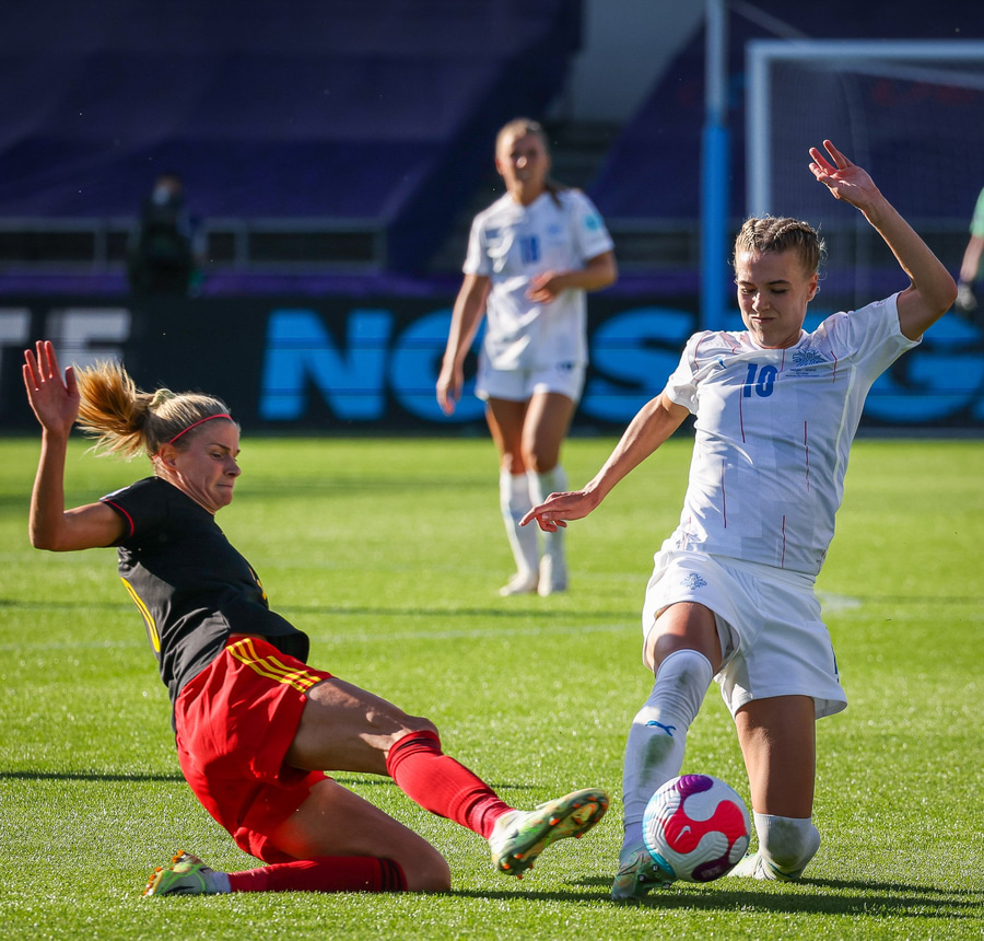Skeiðar upp allan vallarhelming Belgíu og rúmlega það, stendur af sér eina tæklingu og kemst framhjá tveimur varnarmönnum. Hún á svo skot með vinstri fæti sem Evrard ver með sínum vinstri fæti og Ísland á horn.