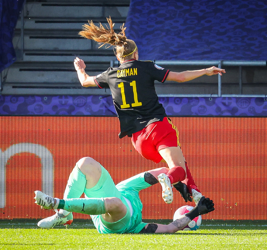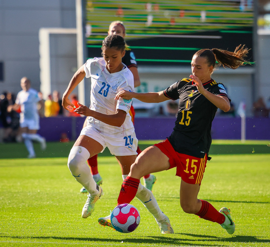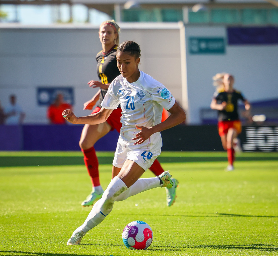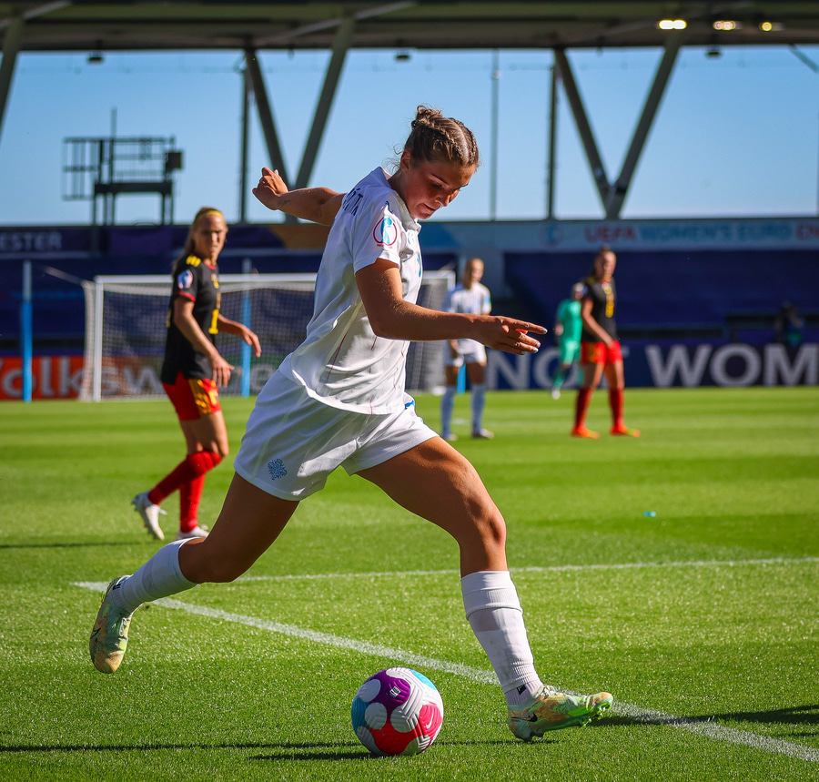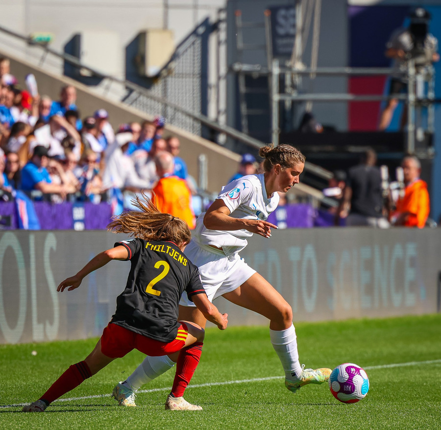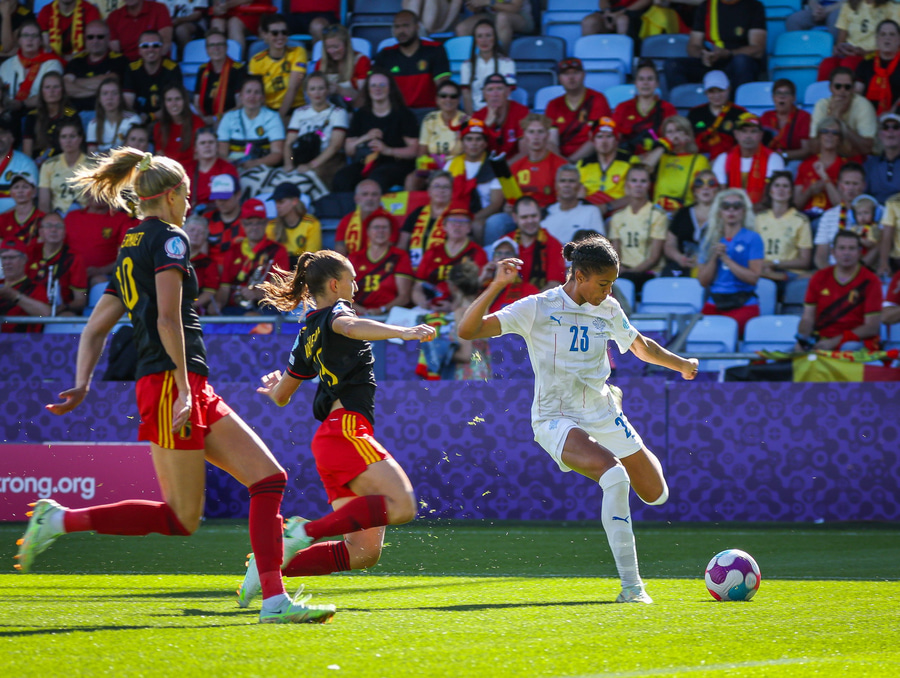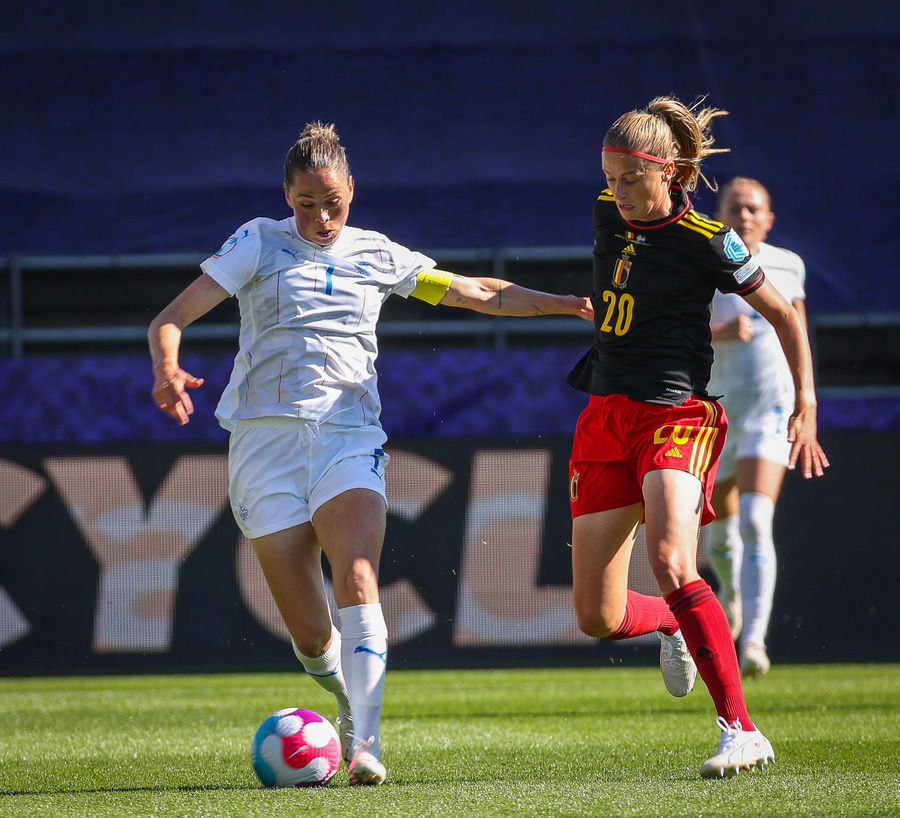Skeiðar upp allan vallarhelming Belgíu og rúmlega það, stendur af sér eina tæklingu og kemst framhjá tveimur varnarmönnum. Hún á svo skot með vinstri fæti sem Evrard ver með sínum vinstri fæti og Ísland á horn.