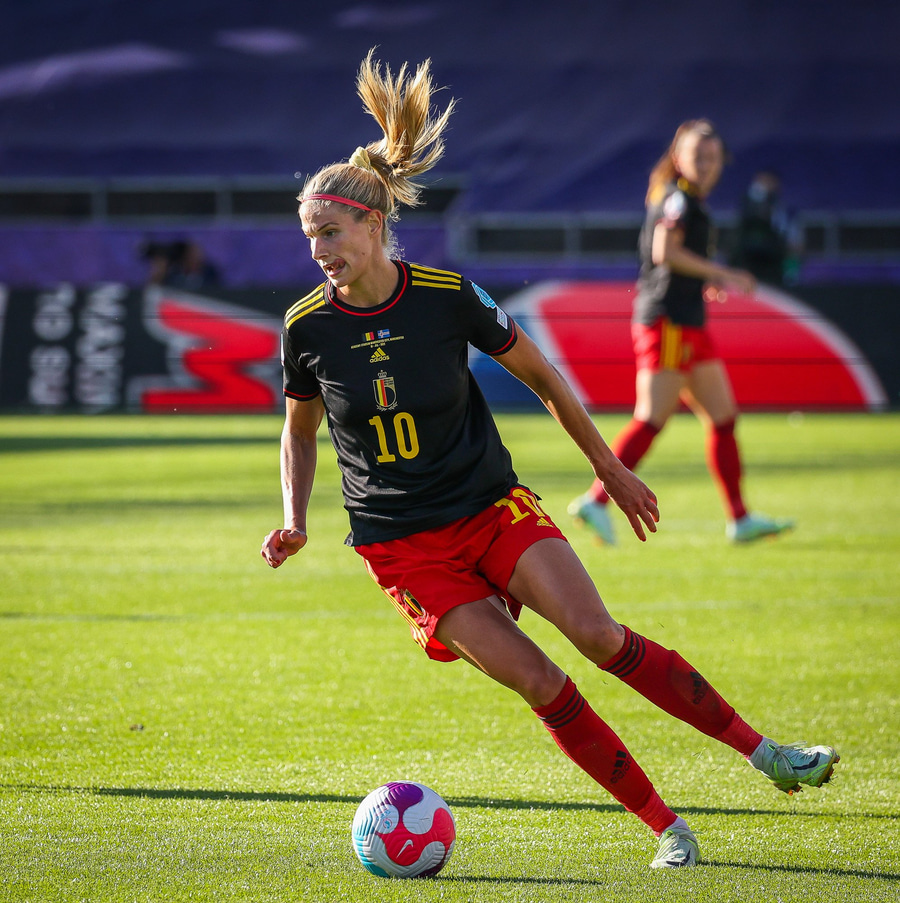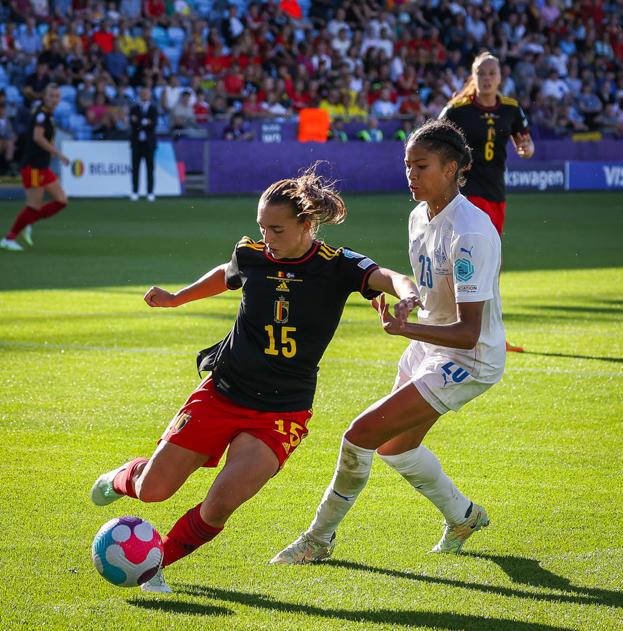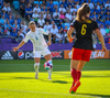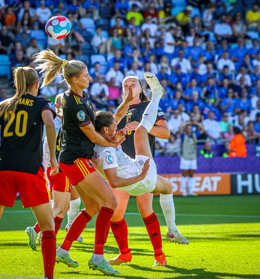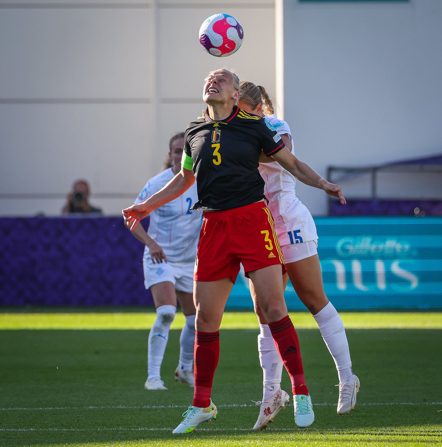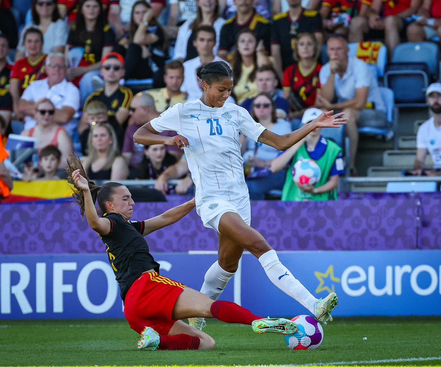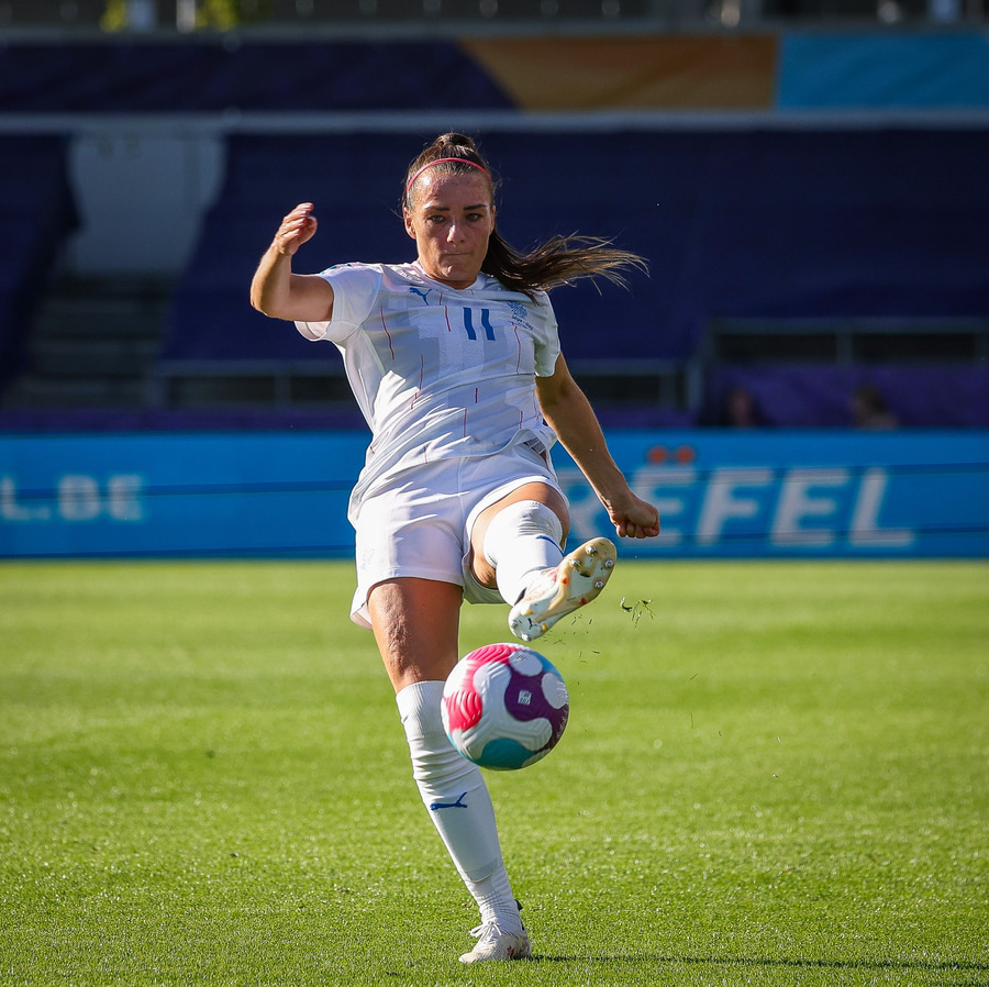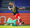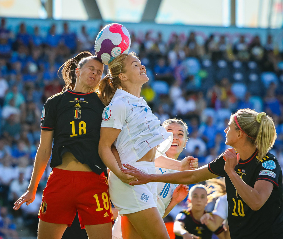 Skeiðar upp allan vallarhelming Belgíu og rúmlega það, stendur af sér eina tæklingu og kemst framhjá tveimur varnarmönnum. Hún á svo skot með vinstri fæti sem Evrard ver með sínum vinstri fæti og Ísland á horn.