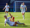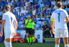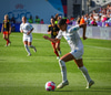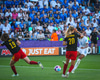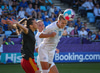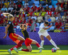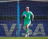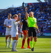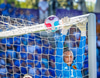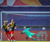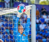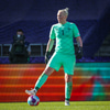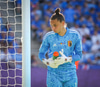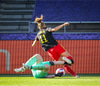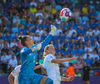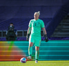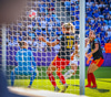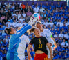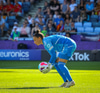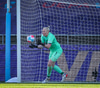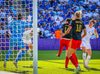 Evrard í markinu hleypur út í teiginn og handsamar boltann.