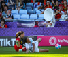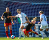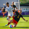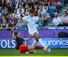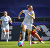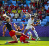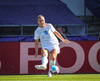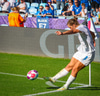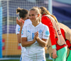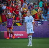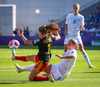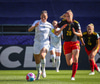 Boltinn hrekkur út fyrir teiginn og svo fær Gunnhildur boltann úti vinstra megin. Gunnhildur reynir skot en hún virðist renna í skotinu og boltinn fer í hliðarnetið á marki Belgíu.