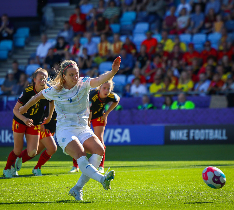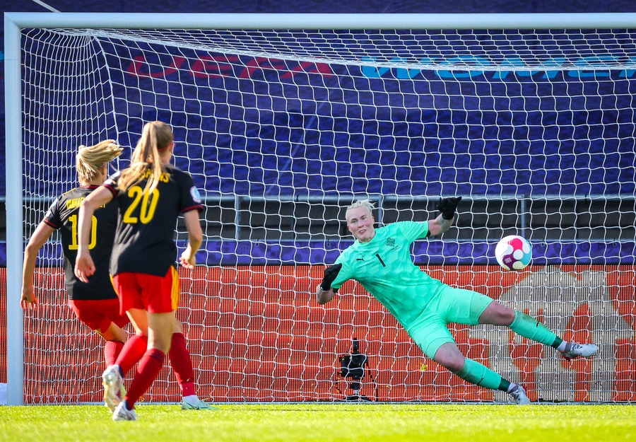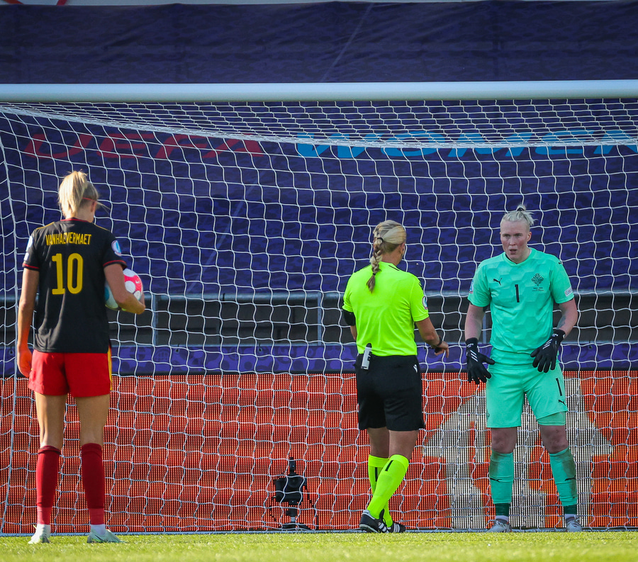 Ãsland fær vÃtaspyrnu eftir að boltin fer à hönd belgÃsk leikmanns inni à teig. Nicky Evrard, markvörður Belga, ver hins vegar frá Berglindi Björgu Þorvaldsdóttur. Upp og áfram👊 pic.twitter.com/CEkAymx0IW
